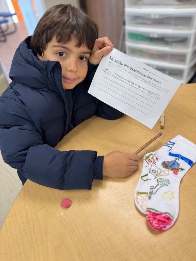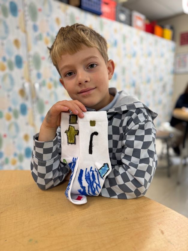 Excitement filled the room as students transferred their final designs onto real socks using fabric markers. Through this joyful process, students discovered that art can be a powerful vehicle for self-expression, one that invites creativity, confidence, and connection.