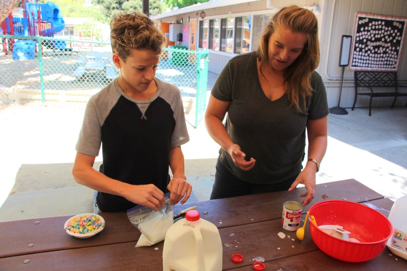 The next Advisory period consisted of making the ice cream the old-fashioned way, by hand. The middle-school students filled zip-lock bags with milk, sugar, and whatever flavoring they chose to make. They then put these sealed bags in a larger zip-lock with rock salt and ice. After ten minutes of shaking, the milk froze and ice cream was made.