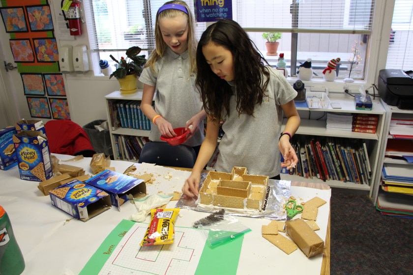 Fifth graders worked together to complete gingerbread house projects. Students worked in pairs to design and build to scale a gingerbread house. First, they reviewed how to figure Area and Perimeter. Then students designed their gingerbread house floor plans. All floor plans could not exceed 432 square centimeters. When complete, students submitted their floor plans, side and front view dimensions and calculations to the Project Manager (Mrs. Peters) for final approval before building.