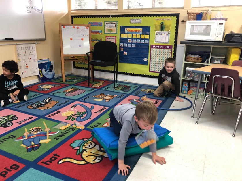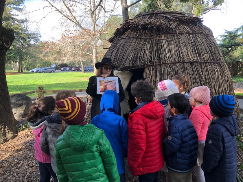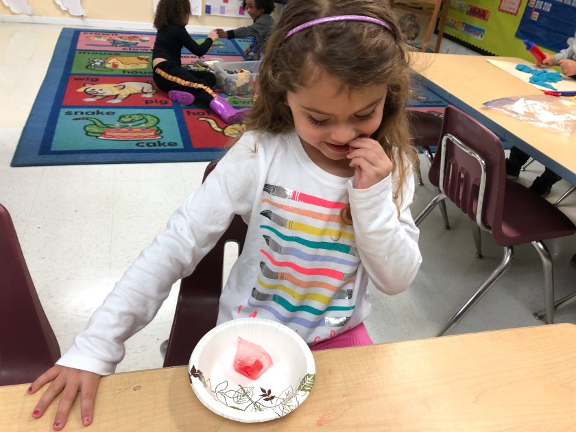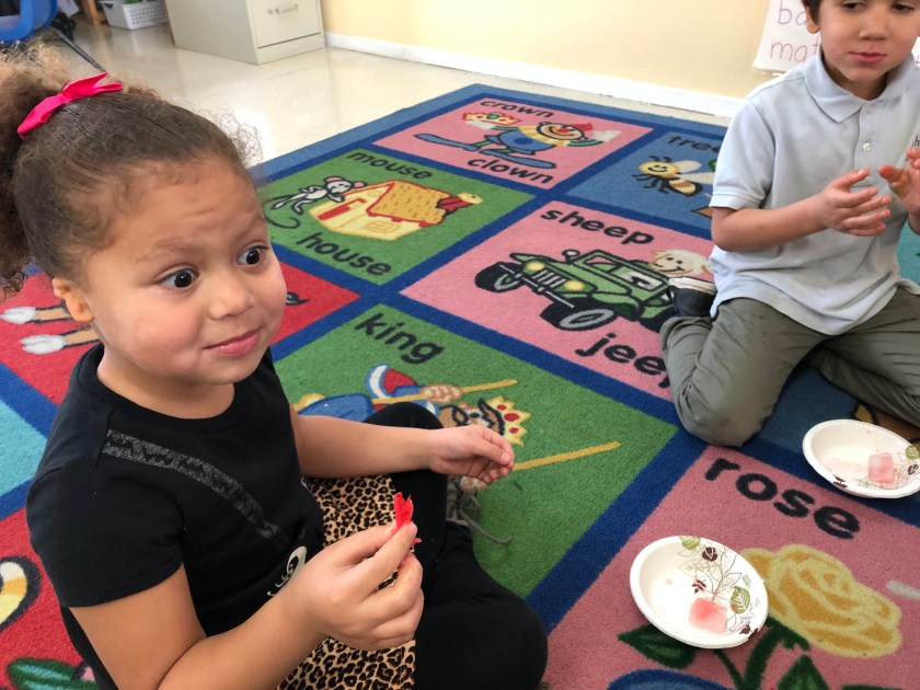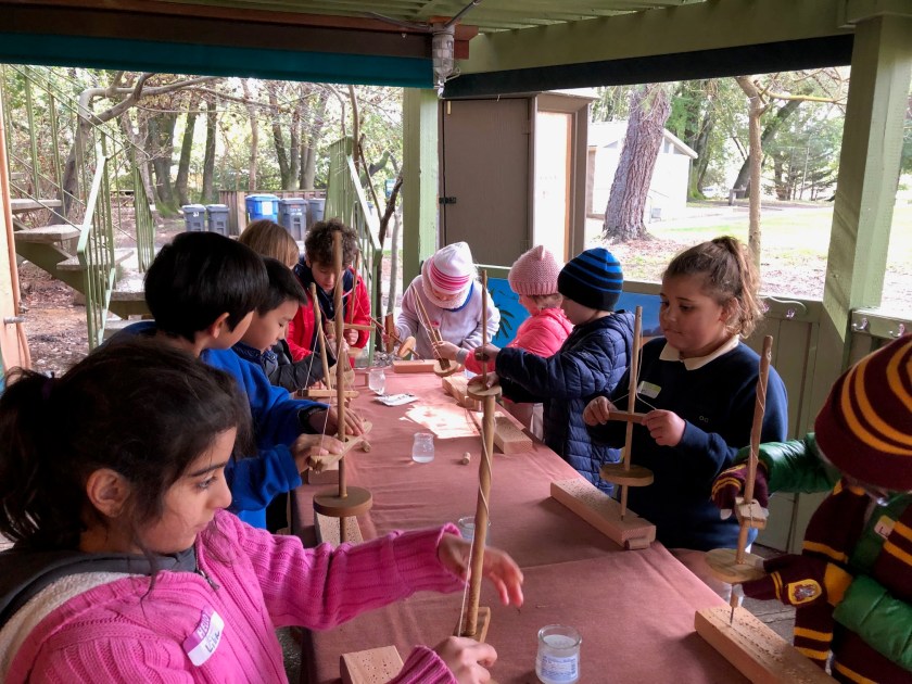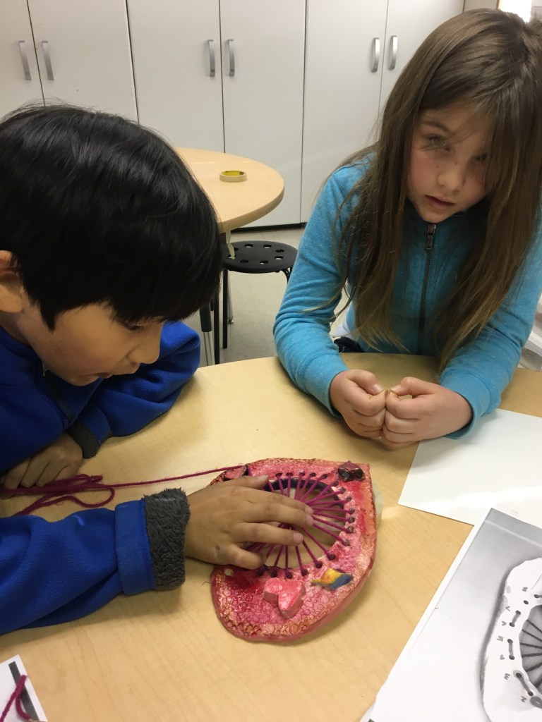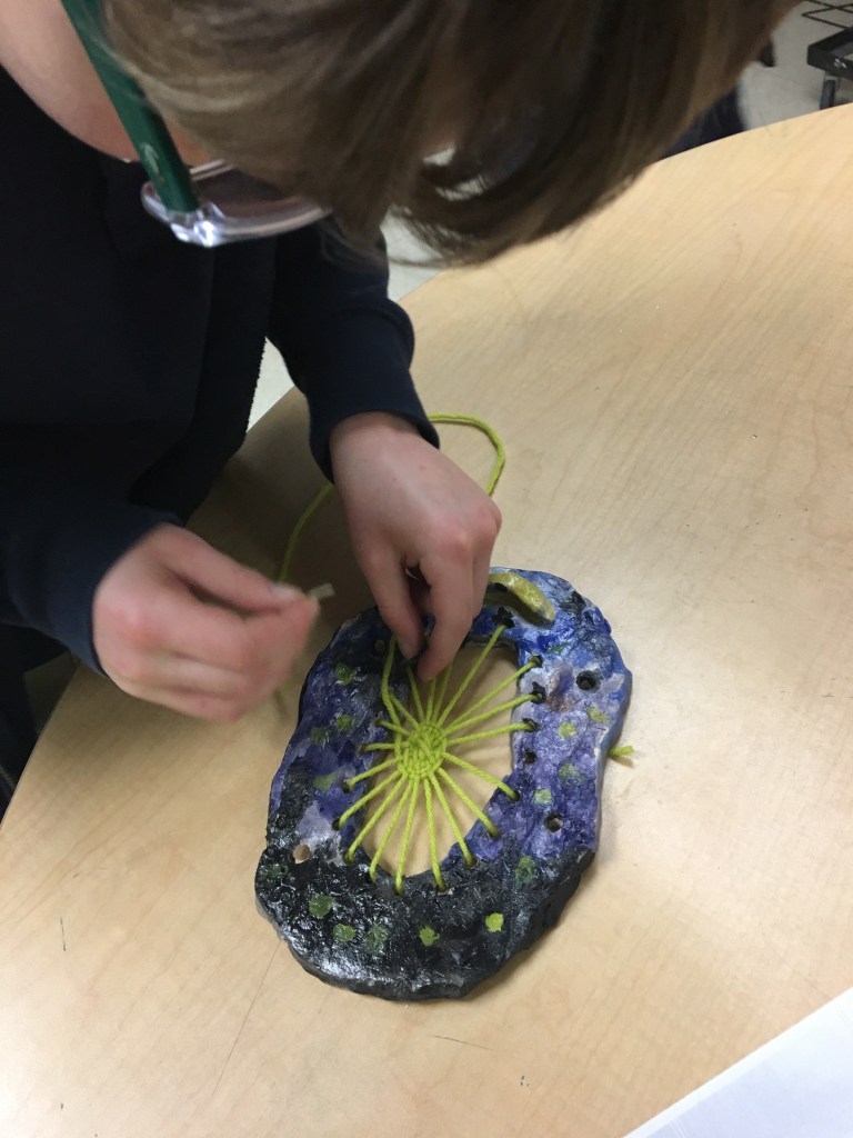 Here, the students are learning to set up their warp yarn and begin the center of their circular weaving. The students worked together to help one another when we got a little stuck in the process. It was a great day of teamwork and problem solving. They were surely proud with the progress they made on their weavings! Next week, they will continue weaving with a second color.