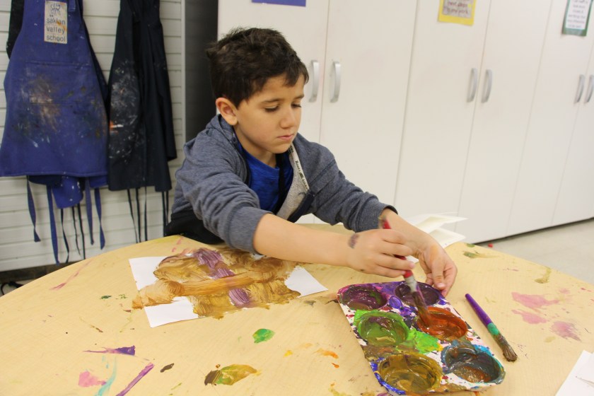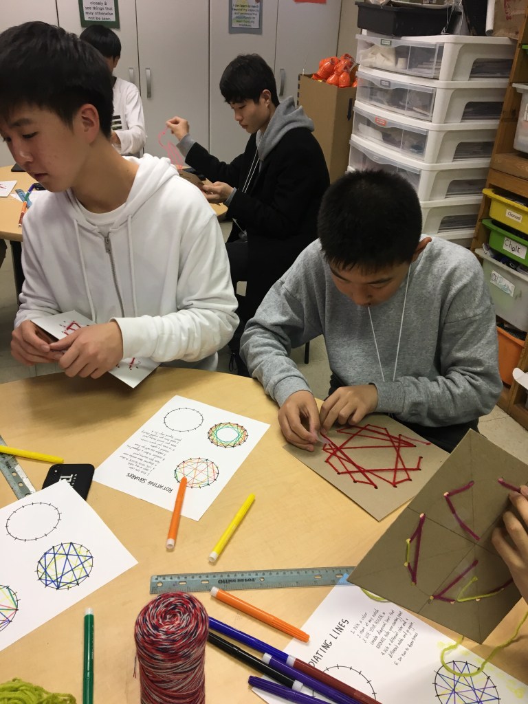 A spectrum is a band of colors, like a rainbow, formed by a beam of light. Using string, the students created their own “beams of light” into designs. They were shown a couple different methods including radiating lines, rotating squares, and a spectrum.