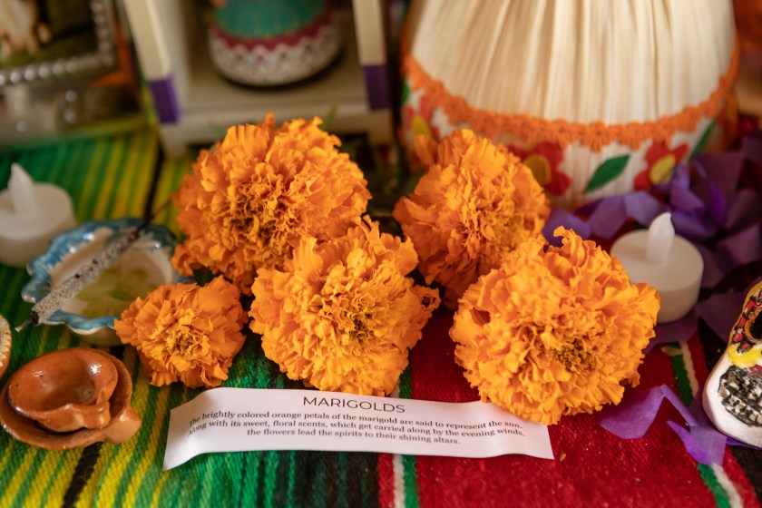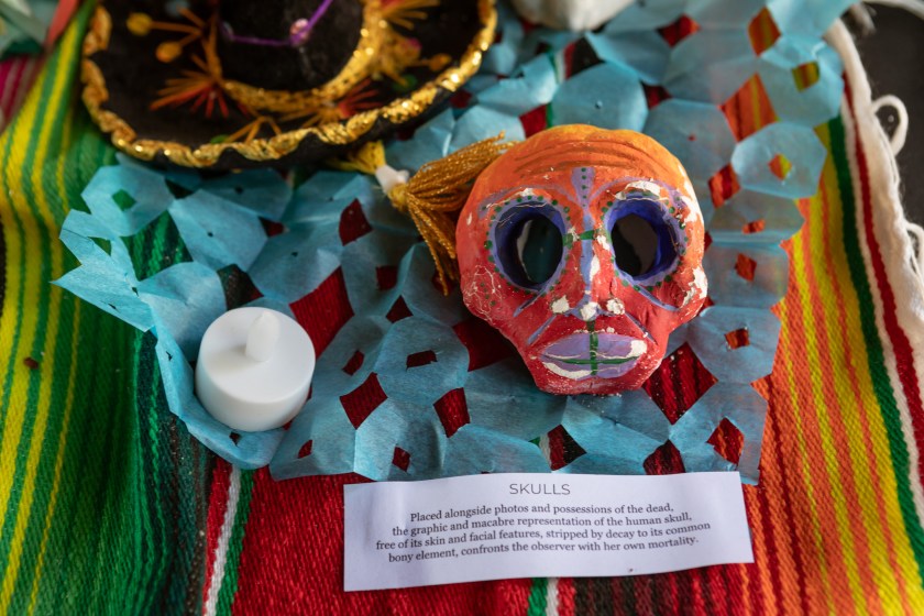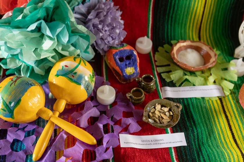 The ceramic skulls were made from past students who wanted them to be kept for the purpose of the altar every year. Placed alongside photos and possessions of the dead, the graphic representation of the human skull, confronts the observer with their own mortality. The brightly colored orange petals of the marigold flowers are said to represent the sun. Along with its sweet, floral scent, which gets carried along by the evening winds, the flowers lead the spirits to their shining altars. As twilight fades away, and family and friends gather around, the flickering lights begin to fill the nooks and recesses of the displays with a warm glow, which helps guide the dead to their altar. This is the fire element and it is believed that color, light, and strong scent of the flowers and candles can guide the souls from cemeteries to their families’ homes.