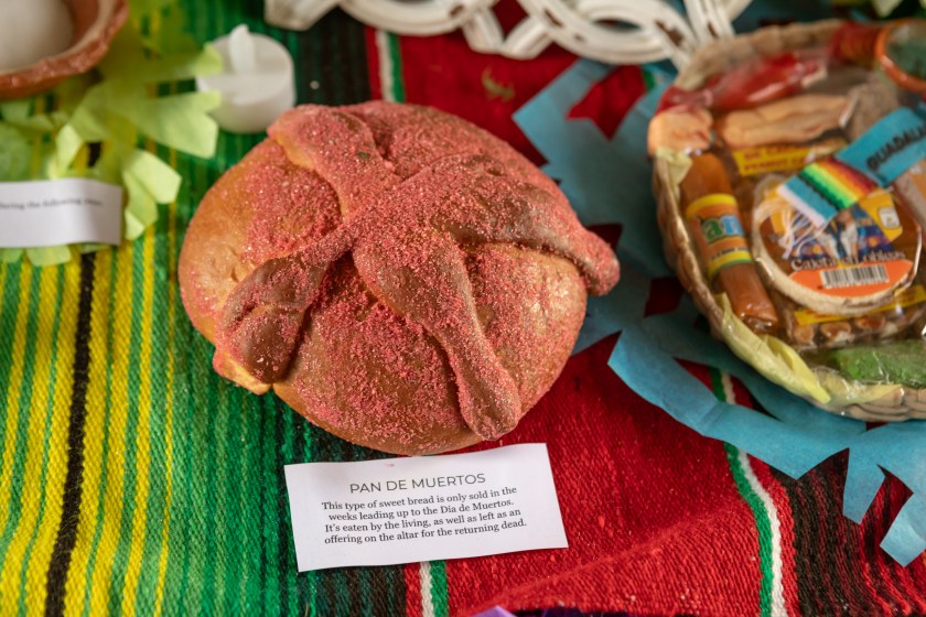 Pan de Muertos (bread of the dead) – which is a type of sweet bread that is only sold in the weeks leading up to the Día de Muertos. It’s eaten by the living, as well as left as an offering on the altar for the returning dead. The soap, a basin of water and the towel helps the spirits of the dead bathe and keep clean while they are back on earth. Pitchers of water are also left so the spirits can quench their thirst after a presumably long journey back home from the afterlife. This altar celebrates the loved ones we have lost within our community, as well as remembering and honoring those who have made an impact in our daily lives but were not directly related to us.
