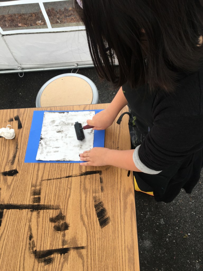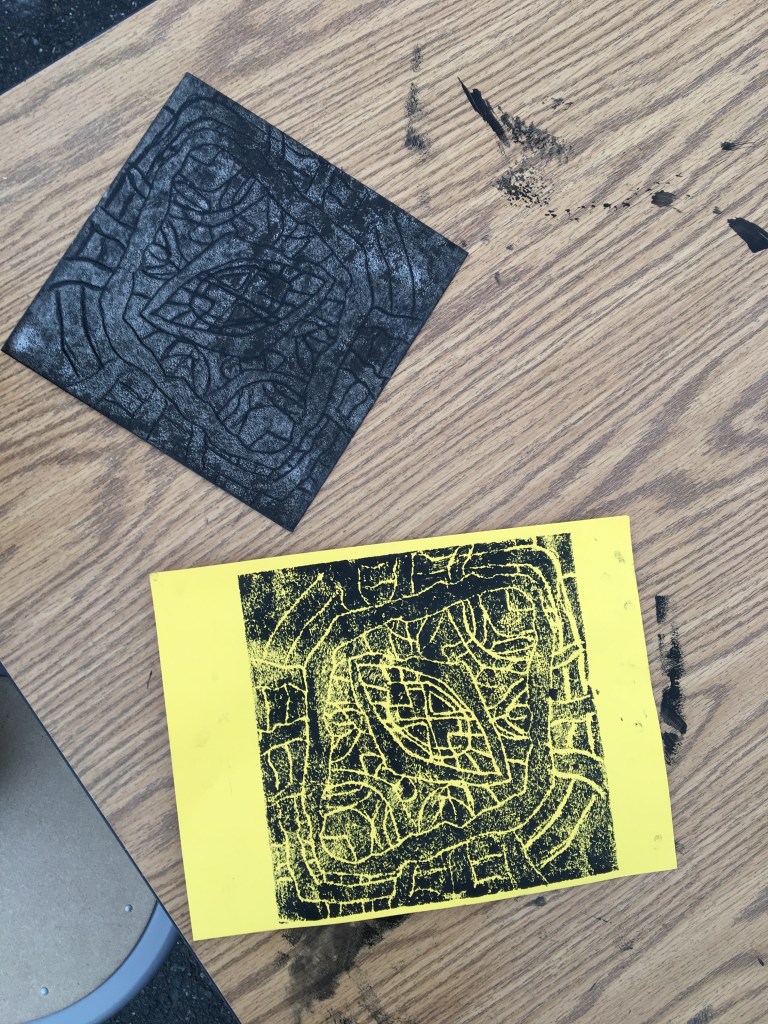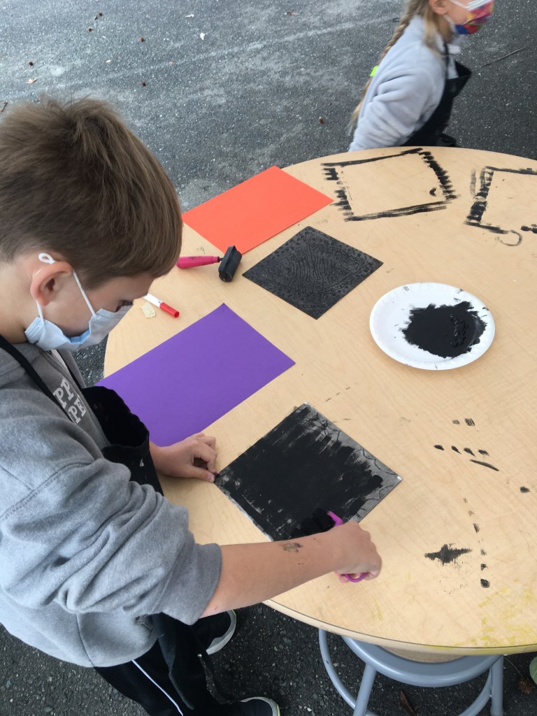 Third grade has been working with radial symmetry, which is symmetry that starts “radiating” from a central point. In art, the students looked at where radial symmetry is in nature and in human-made items such as Moroccan and Mexican tiles. Using variations of line thickness along with geometric and organic shapes, the students were able to create a symmetrical work of art that encompasses balance and unity. The printmaking process was notably the most exciting part of the project and the third graders were eager to print as many as possible!