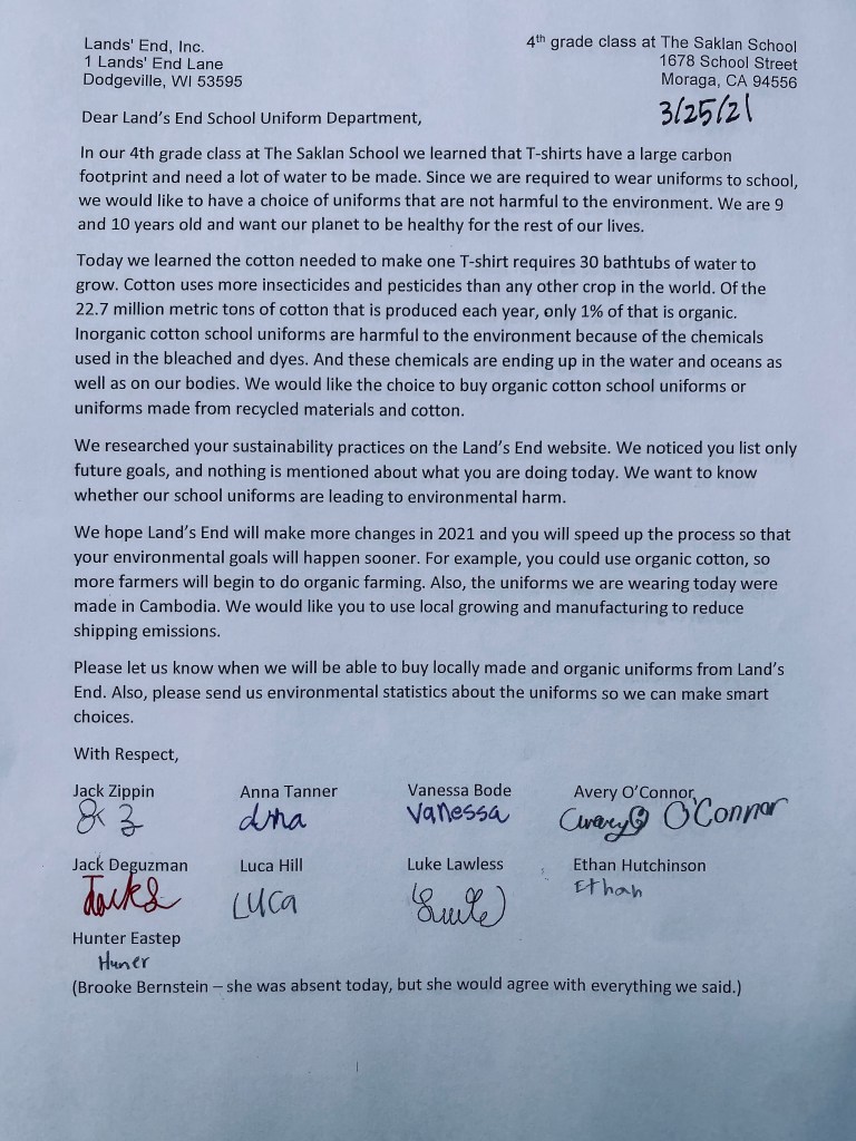 Saklan uniform shirts are made by Land’s End, but a review of the company’s sustainability webpage left the fourth graders dissatisfied. There were plenty of promises for what the company would do in the future, but very little information on what they are doing now.