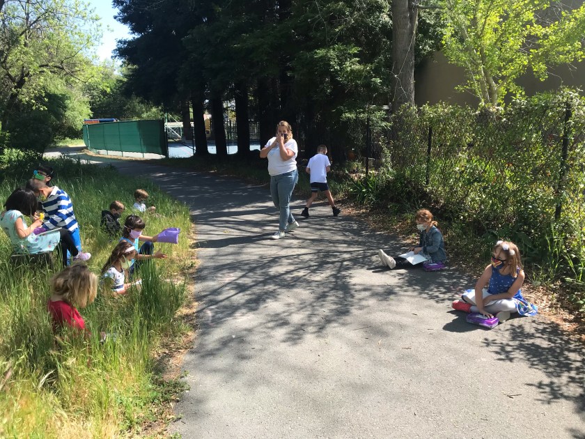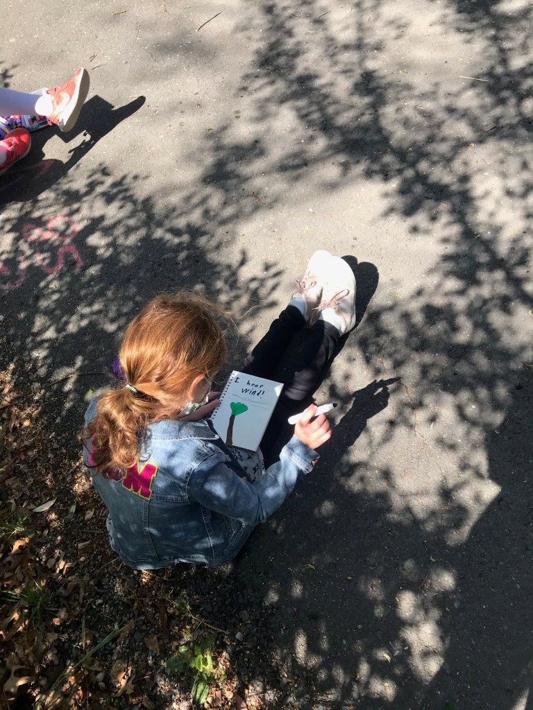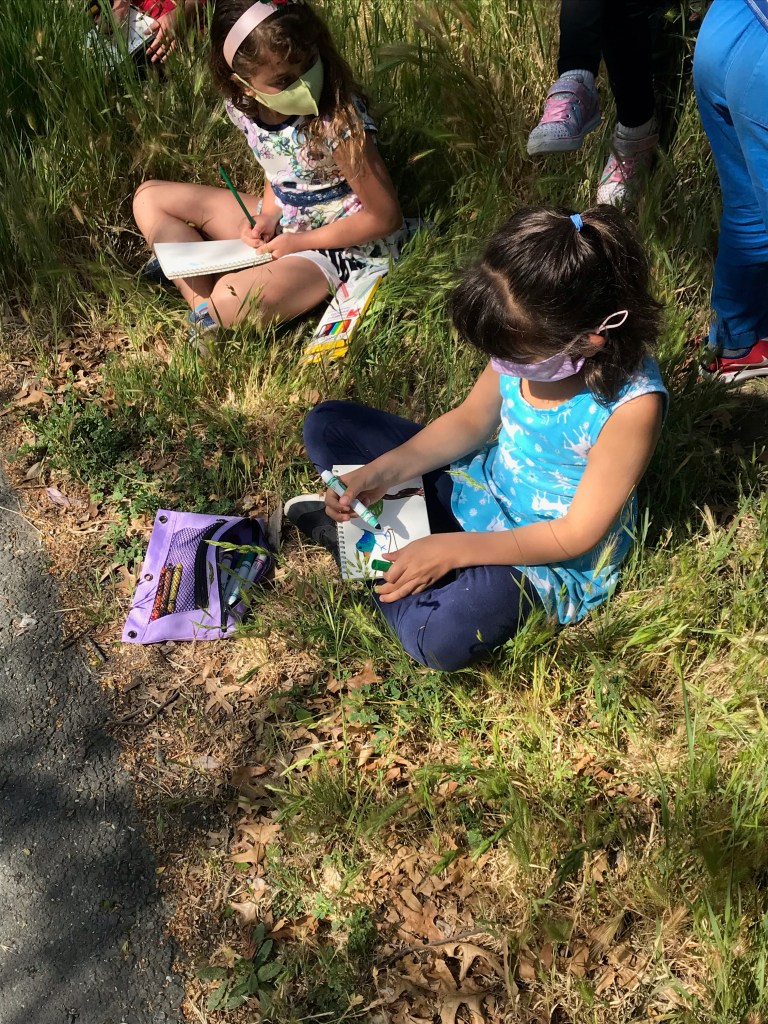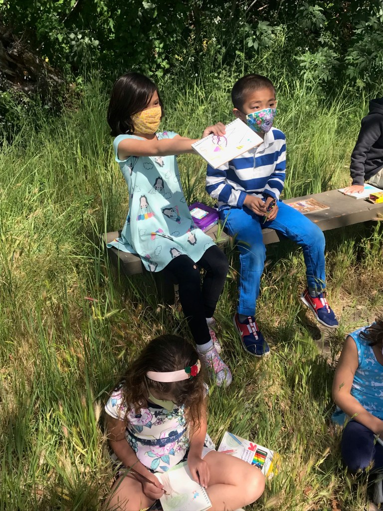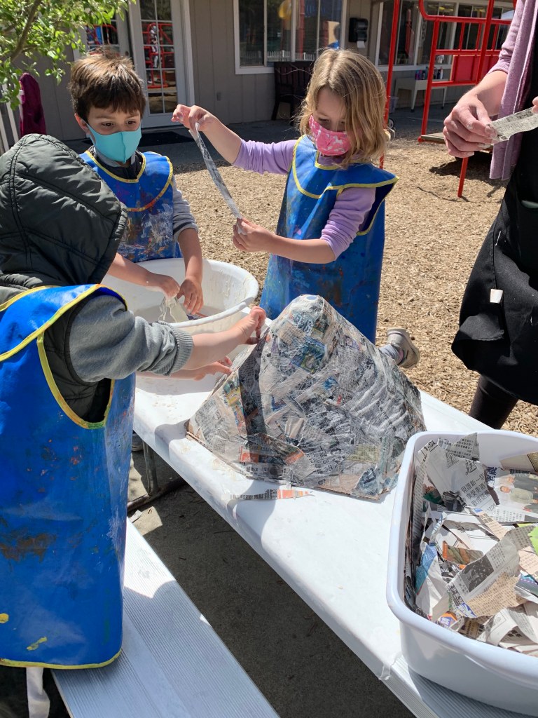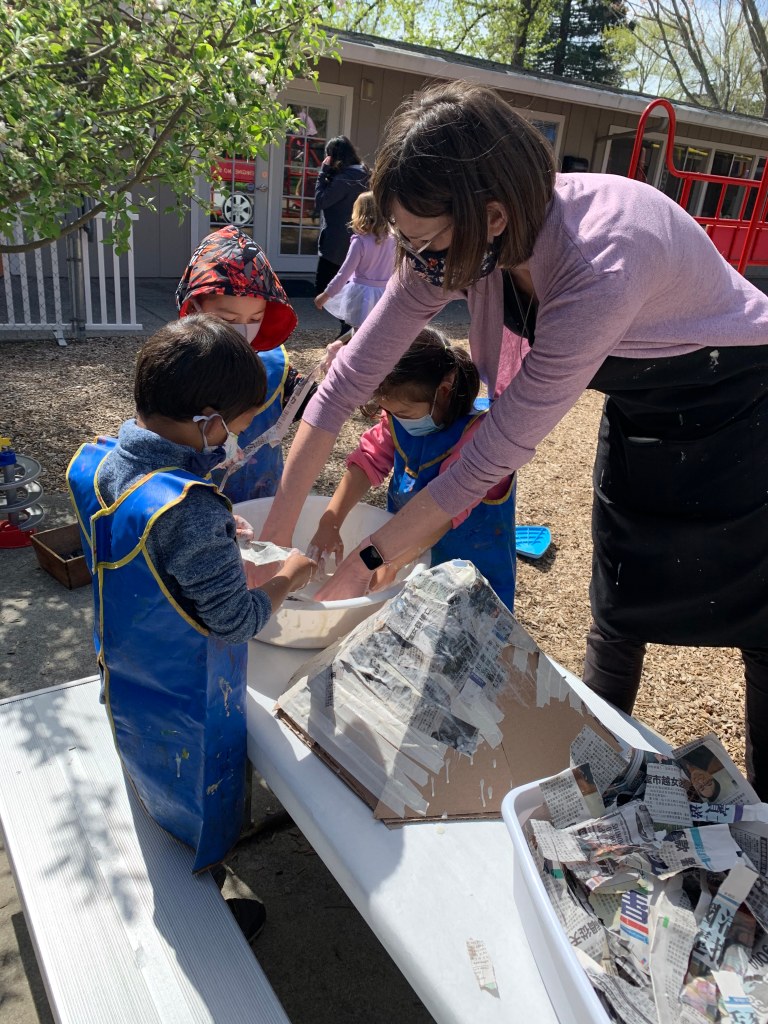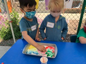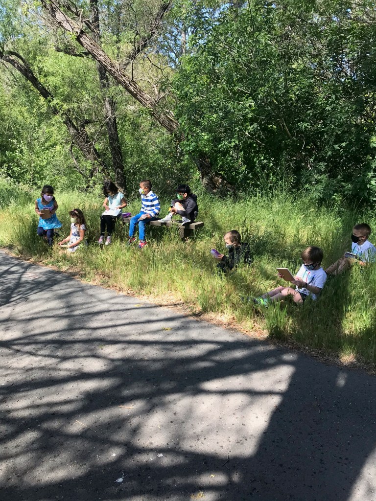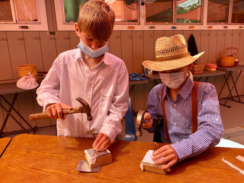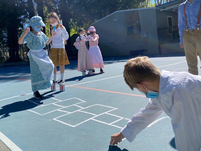 During morning recess, students played like pioneers. They walked on can stilts, used jump ropes, and played hopscotch and jacks. Afterwards, they listened to pioneer stories from Ms. Meredith under a shady tree and made some pioneer crafts with Ms. Meredith and Ms. Joy: tin punch art and yarn dolls.