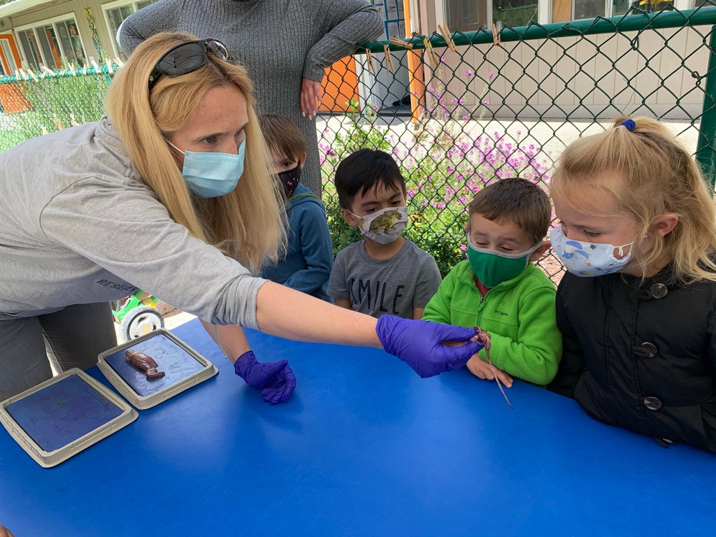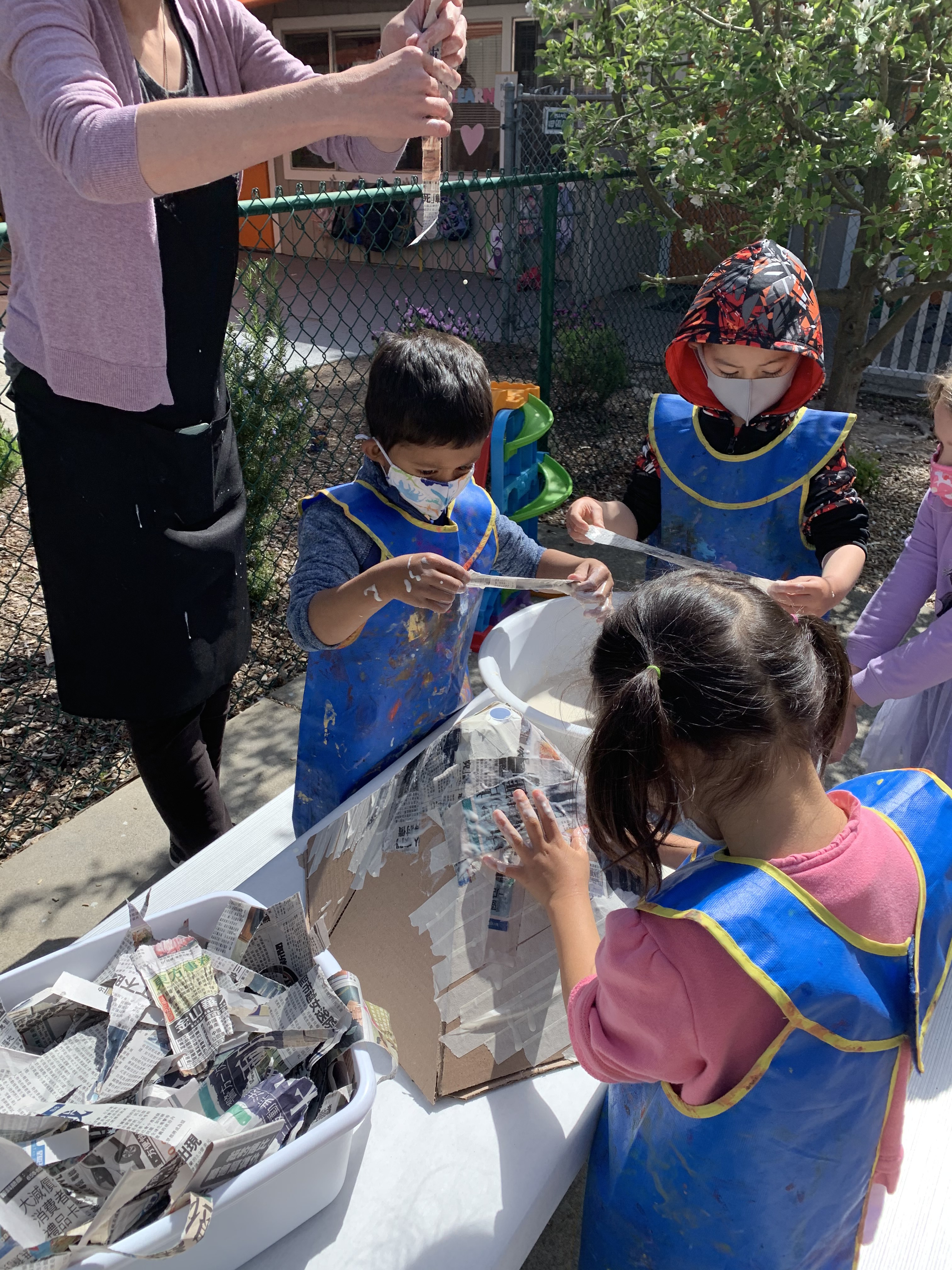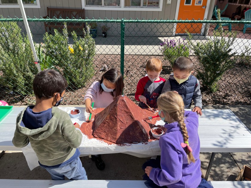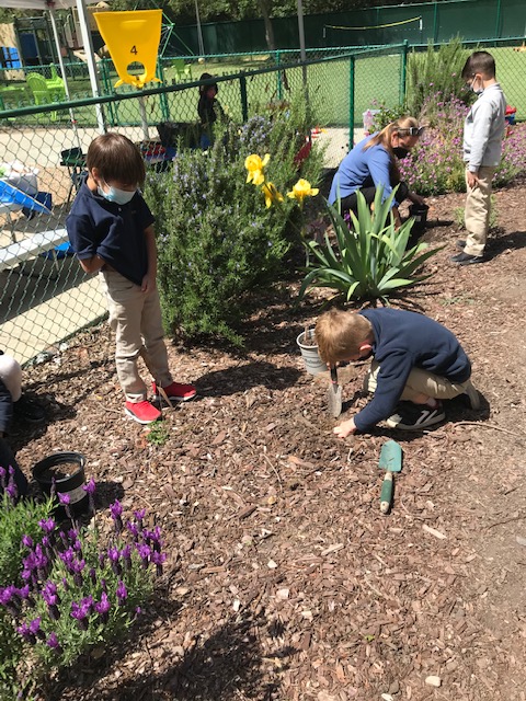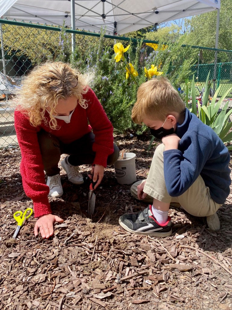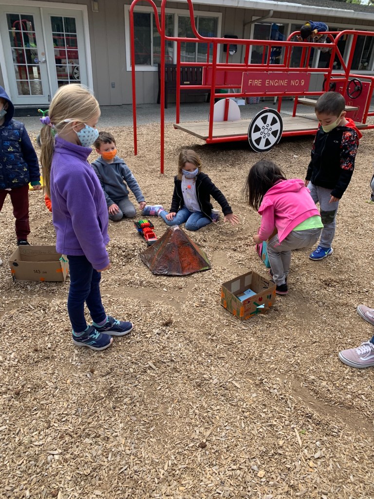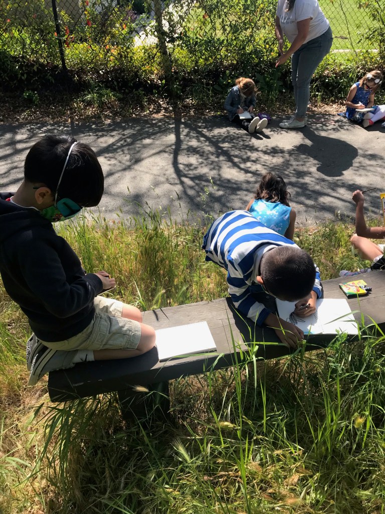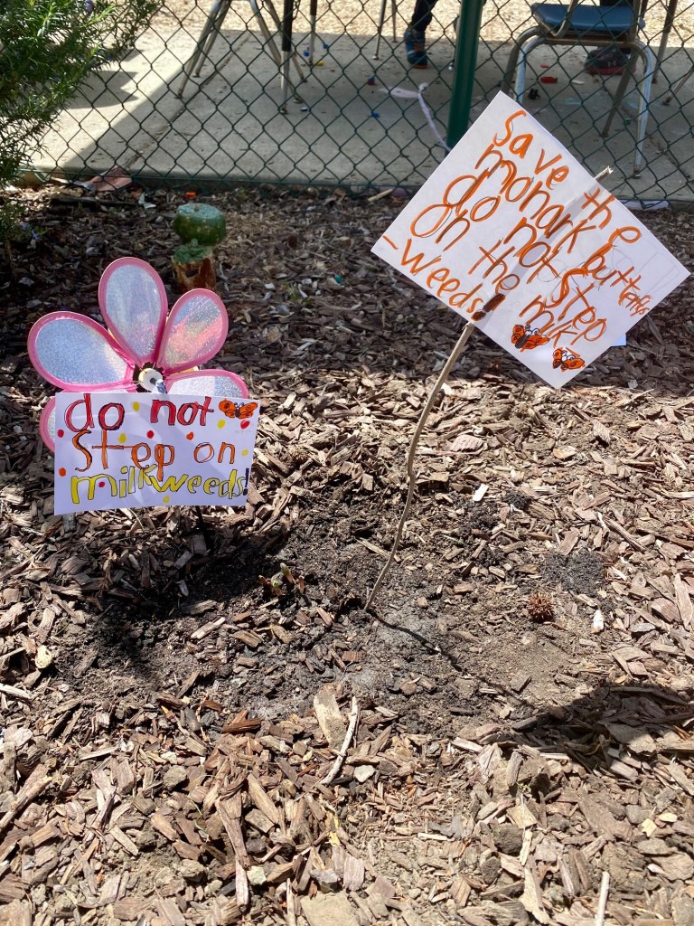During morning recess, students played like pioneers. They walked on can stilts, used jump ropes, and played hopscotch and jacks. Afterwards, they listened to pioneer stories from Ms. Meredith under a shady tree and made some pioneer crafts with Ms. Meredith and Ms. Joy: tin punch art and yarn dolls.