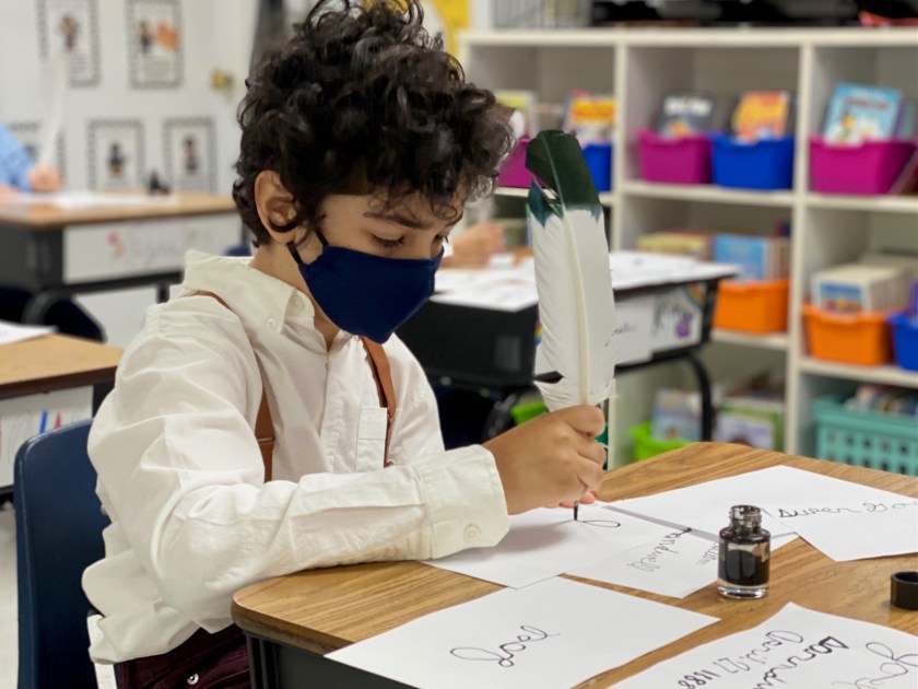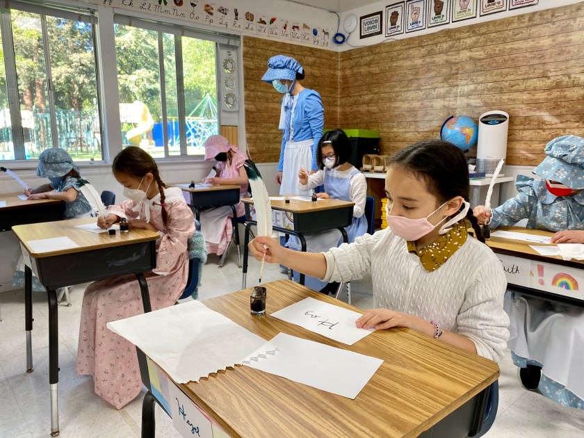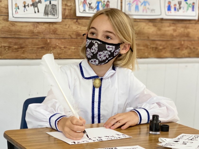 Mrs. Rokas, with the help of Ms. Meredith and Ms. Joy, brought traditional pioneer activities into her own classroom. The day started in the classroom with the three R’s: reading, writing and arithmetic. Students read from McGuffey Readers (published in 1879), practiced their cursive writing using quill feather pens and ink, and practiced their math on slate boards with chalk. They also had a spelling bee!