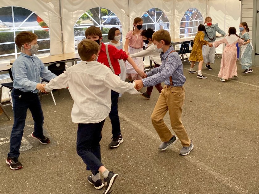 For lunch, each pioneer student brought authentic pioneer food in baskets, pails or tied to a stick. After lunch, students sang pioneer songs and learned square dancing with Mrs. Chaffey. Next, they made butter in mason jars and tasted the delicious homemade butter on biscuits brought by Kaylah.