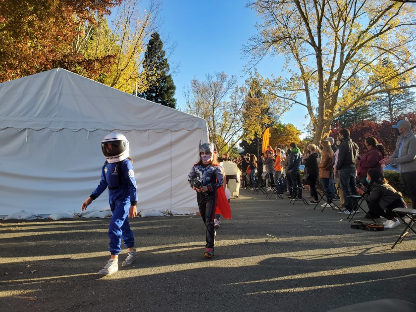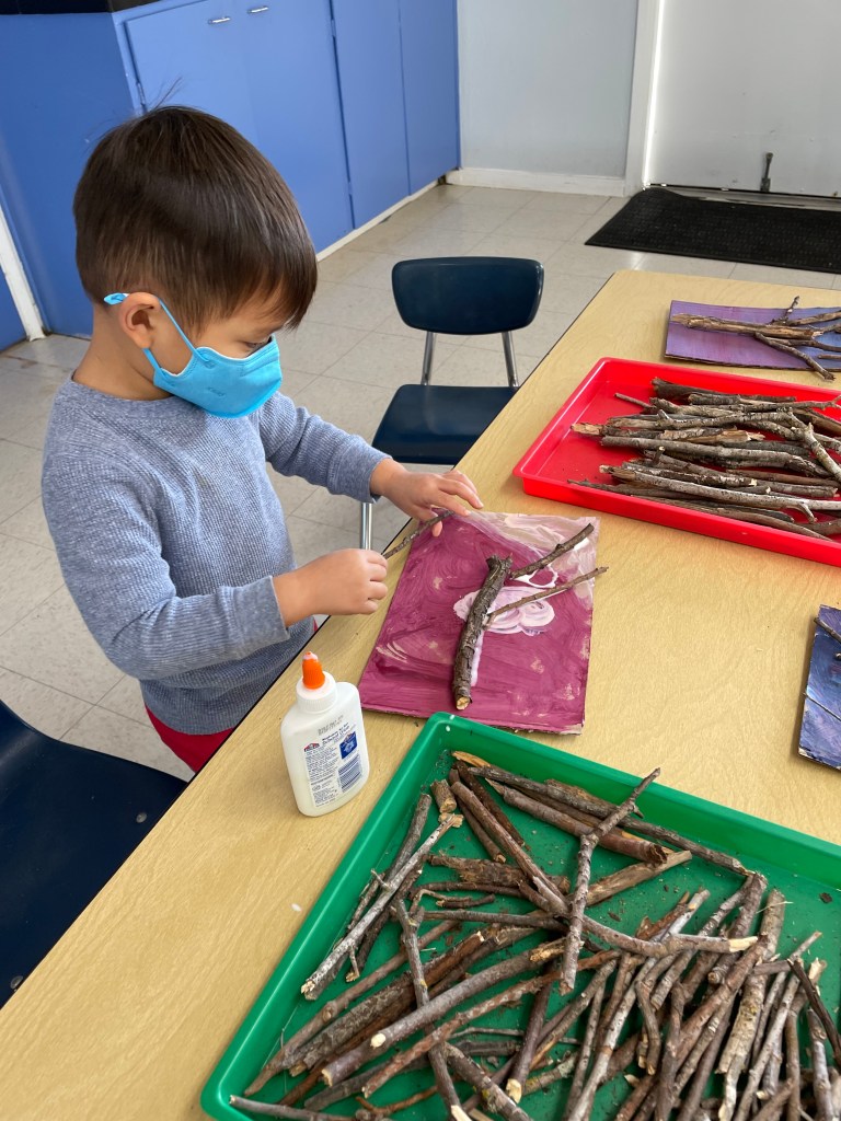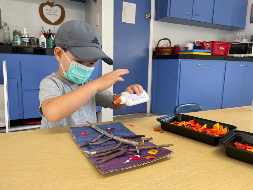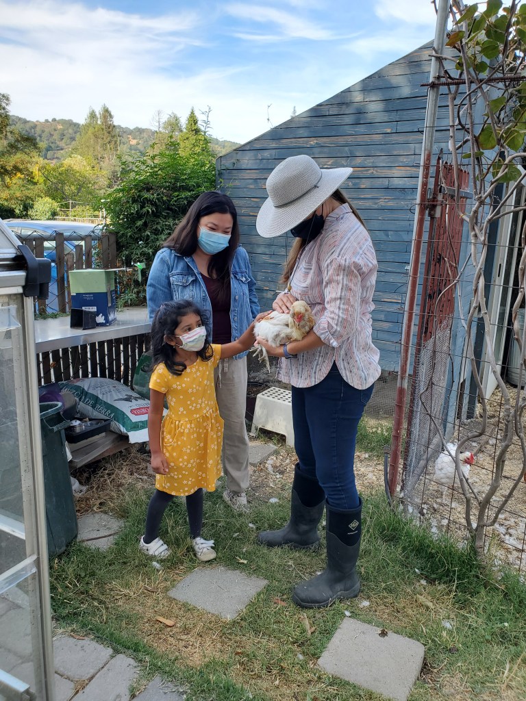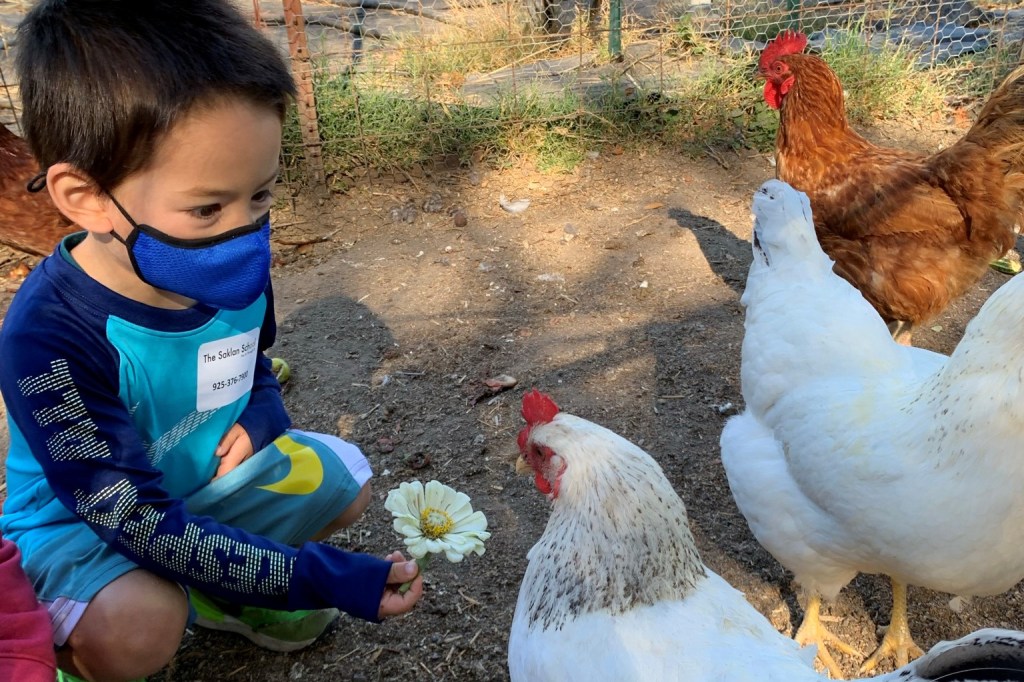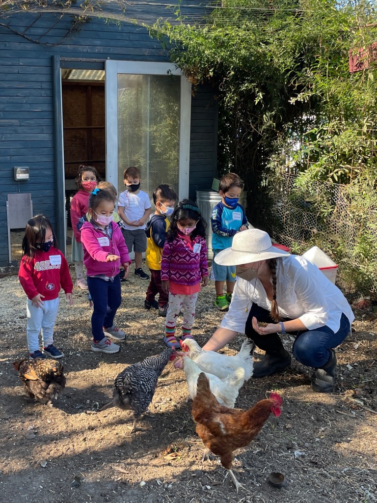 During the tours, students learned that fruits and vegetables grow from flowers after being pollinated. They saw the difference between seasonal trees, such as a peach tree (summer) and persimmon tree (fall). The children saw how vines grow by attaching their tendrils to other structures and plants, and how plants defend themselves from predators. They went inside the greenhouse, heard the bees buzzing in their hives, and got to sample some of the garden’s produce. Lastly, the students were invited to feed and pet the chickens.
