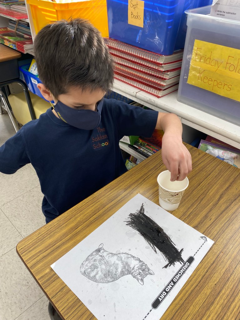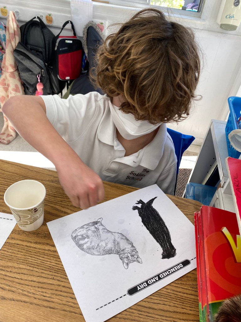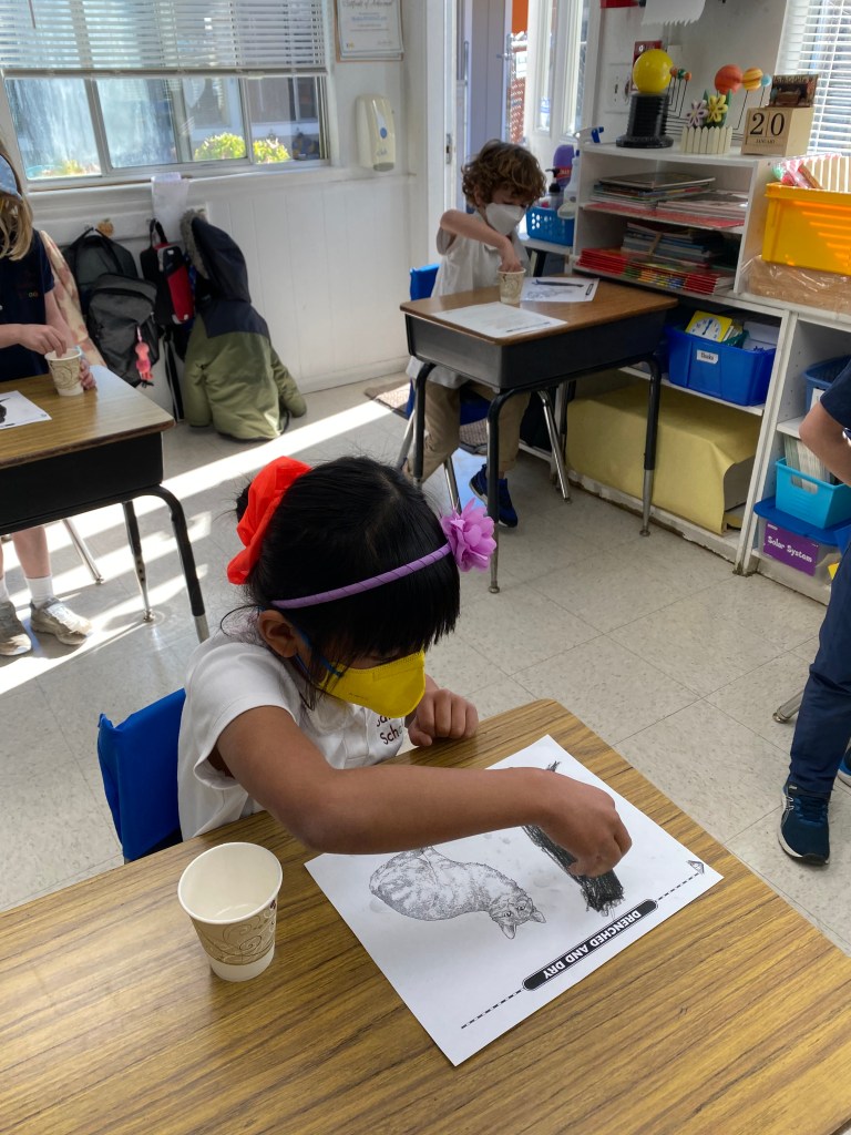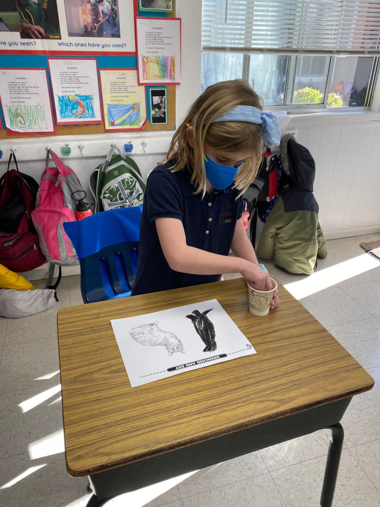 Did you know that penguins spend a lot of time applying wax to their outer feathers? The wax comes from a gland at the base of their tail, and they use their beaks to apply it to the rest of their body. To find out how waxy feathers help penguins, the first graders colored a penguin using crayons to emulate the wax on their outer feathers, while leaving a picture of a cat uncolored (without wax). The students then sprinkled water on both animals, and discovered how a penguin’s body let less water through the paper than the cat’s body. The students not only enjoyed this hands-on activity, but came to truly understood how wax helps the penguins.