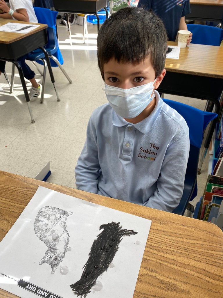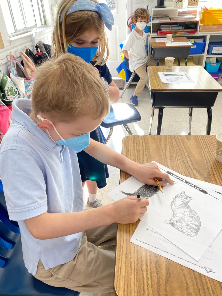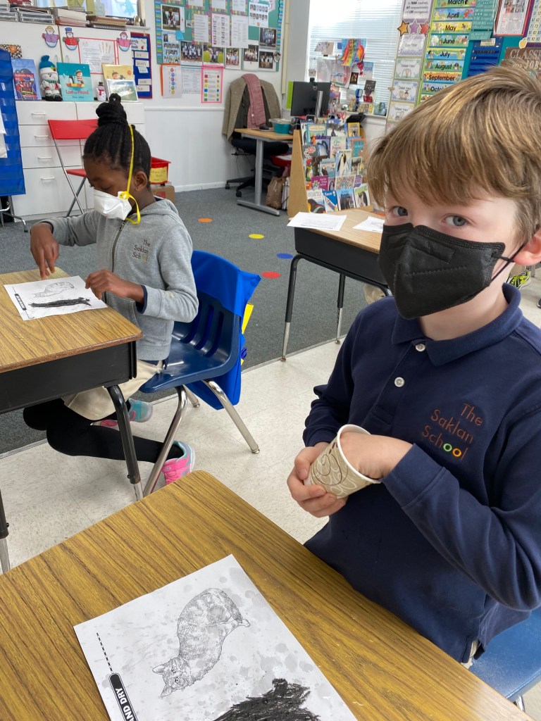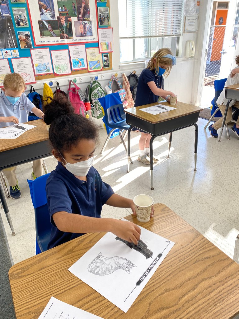 Did you know that penguins spend a lot of time applying wax to their outer feathers? The wax comes from a gland at the base of their tail, and they use their beaks to apply it to the rest of their body. To find out how waxy feathers help penguins, the first graders colored a penguin using crayons to emulate the wax on their outer feathers, while leaving a picture of a cat uncolored (without wax). The students then sprinkled water on both animals, and discovered how a penguin’s body let less water through the paper than the cat’s body. The students not only enjoyed this hands-on activity, but came to truly understood how wax helps the penguins.
