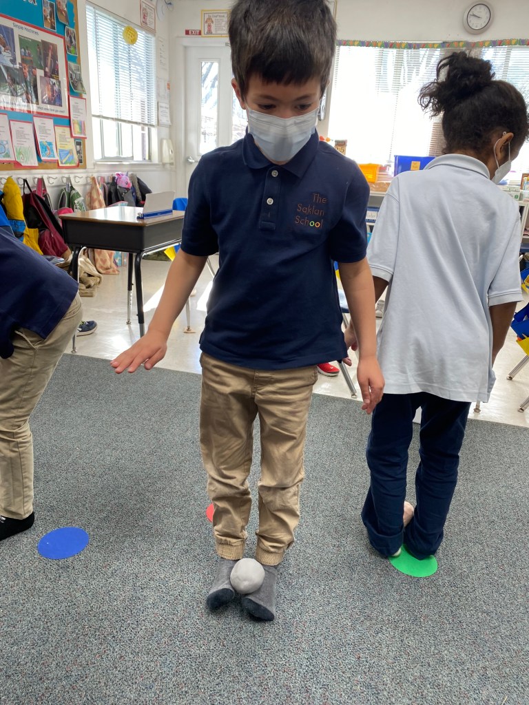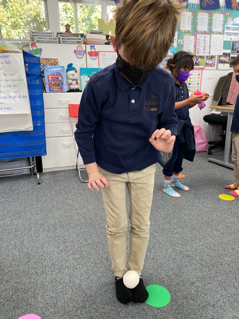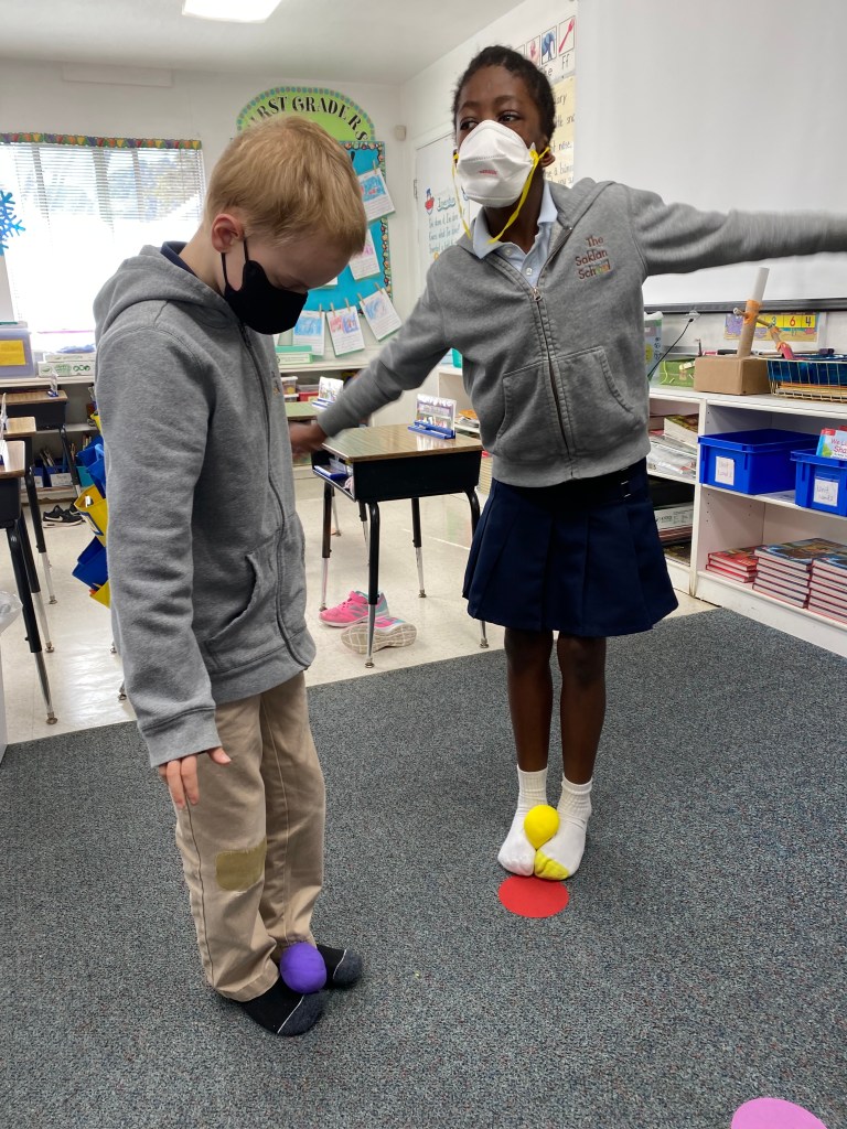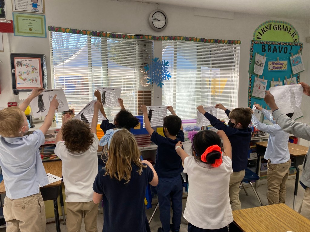 The first grade class read lots of information about penguins, learning about their physical characteristics, habitat, offspring, and what they eat. To make their reading come to life, the students participated in hands-on, fun activities including “Emperor for a Day.” To start the activity, the first graders created emperor penguin eggs out of clay. Then they took their shoes off, kept their socks on, curled up their feet, and we had fun walking like penguin parents, with their egg on their feet. The students discovered that it is harder than they thought it would be!