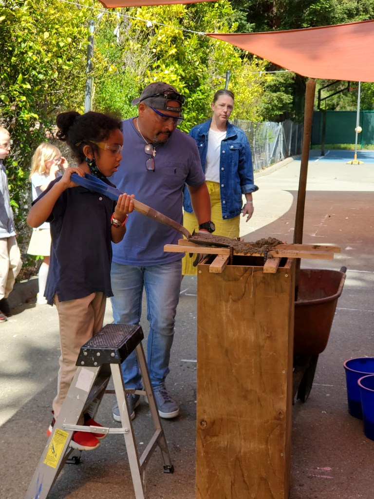 The first graders joined the eighth graders and Mr. Javier to get a hands-on demonstration of the home building process in Puerto Rico. The first graders helped mix cement, adding in extra rocks and sand to make it even stronger. The group then filled a preformed column, which Mr. Javier had already inserted rebar reinforcements into, with the cement.