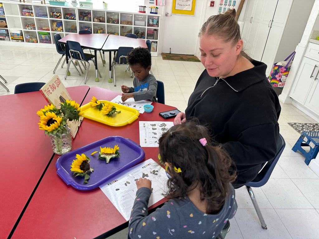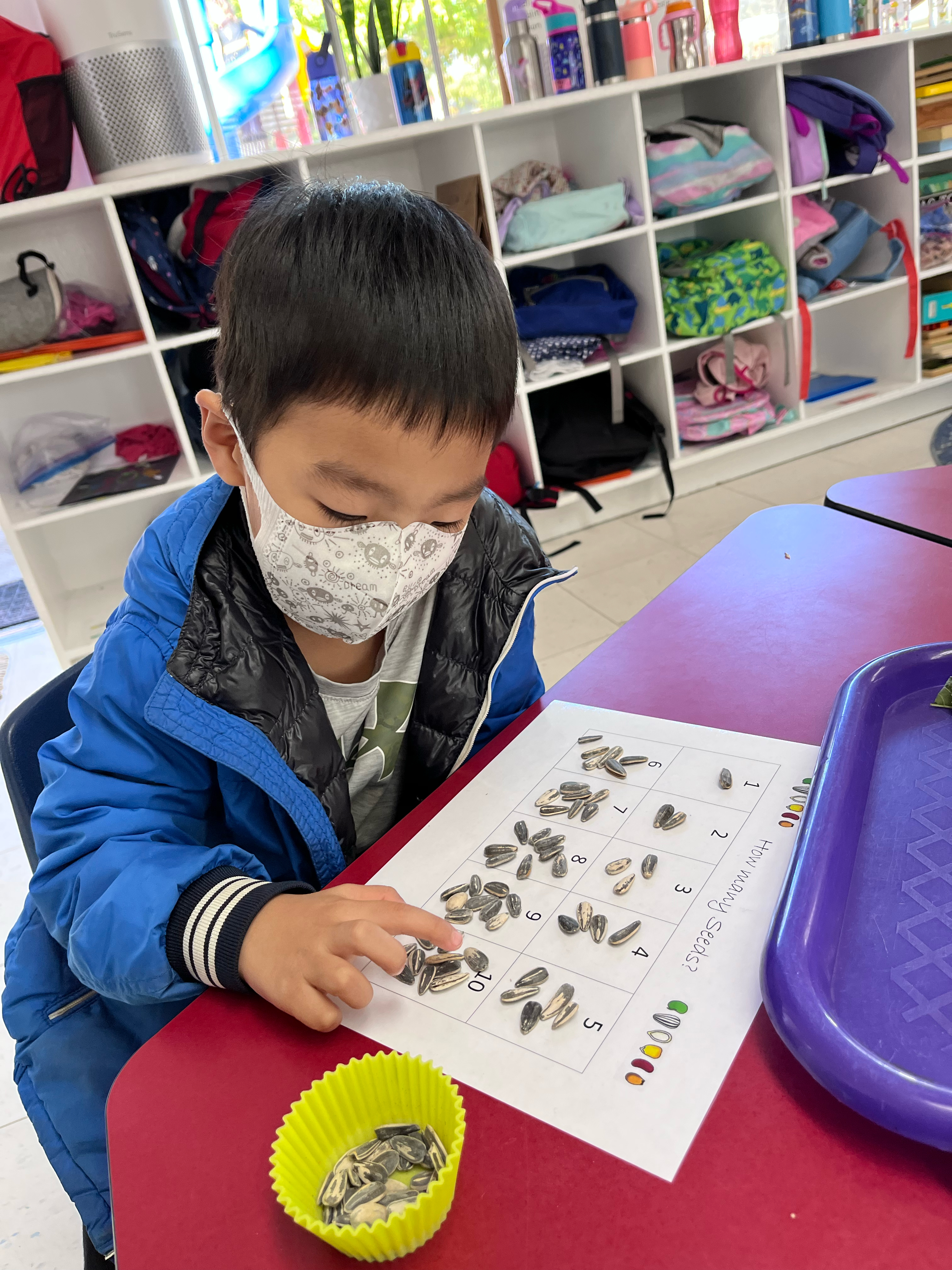 For the letter Bb, the class read the book Burt the Beetle Doesn’t Bite by Ashley Spires, and then created their own bugs with Philippa. The Owlets named their bugs and described their “superpowers” like the bugs in the book. They also read The Bad Seed by Jory John, and then observed some sunflowers and sunflower seeds. Ms. Erin helped the students learn about sequencing and quantifying as they counted the seeds.