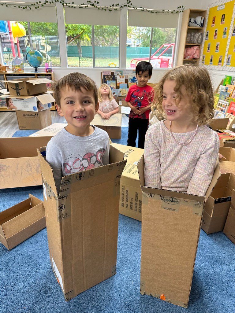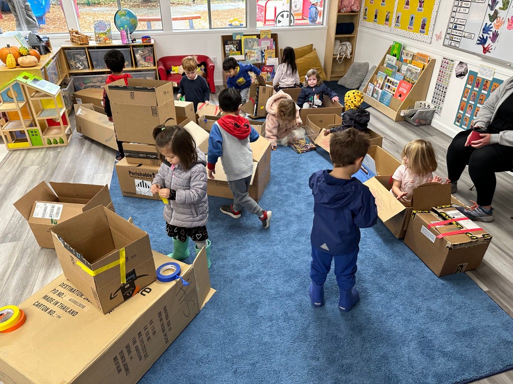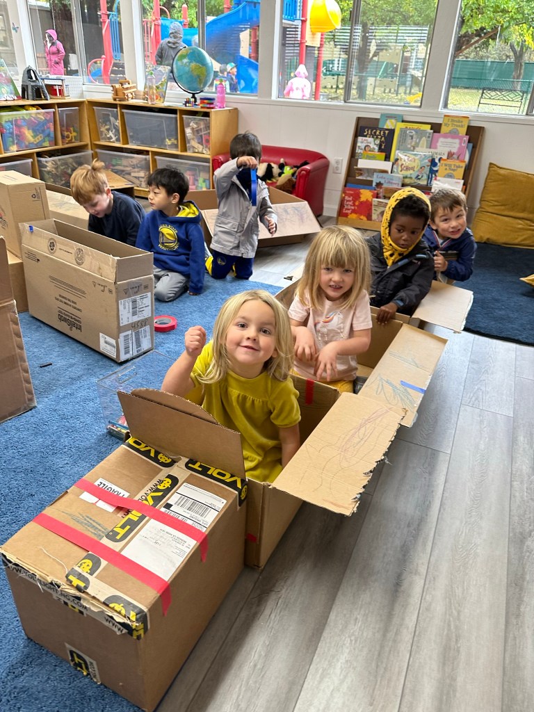 The Owlets also read Not a Box by Antoinette Portis and spent a rainy day getting creative with tons of cardboard boxes. The students loved making trains, mountains, cars, robots, and many other fun things!