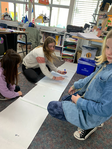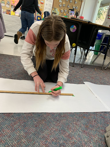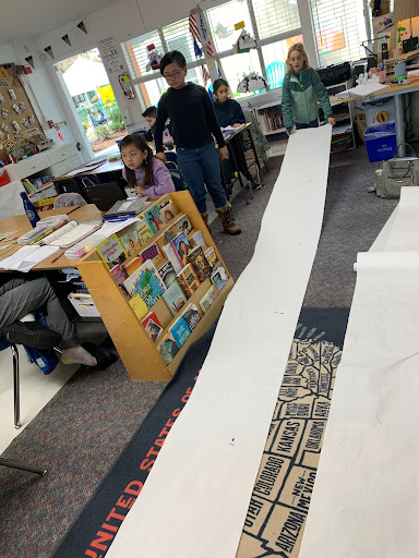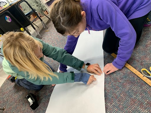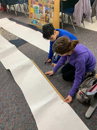 Another day, the students measured out 7 ¾ yards of “fabric” (they used white paper from a long roll, but visualized it as fabric). Students then measured 2 ¼ yards of the “fabric,” representing a remnant after making curtains from the original cut. Since their classroom mat area is not even 7 ¾ yards across, and their yard sticks are 39.37’/100cm rulers, there were many built-in opportunities for critical thinking, creative problem solving, negotiating, and sharing of roles to model and explain the answer to the question, “How much fabric was used to make the curtains?”