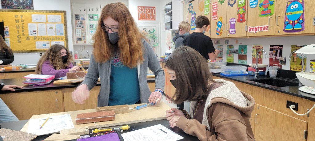 Since February, the 8th graders have been studying physics in science class. They have been learning about the forces of gravity, air resistance, and friction on our planet. The students have also been working on putting Newton’s three Laws of Motion into real life scenarios.