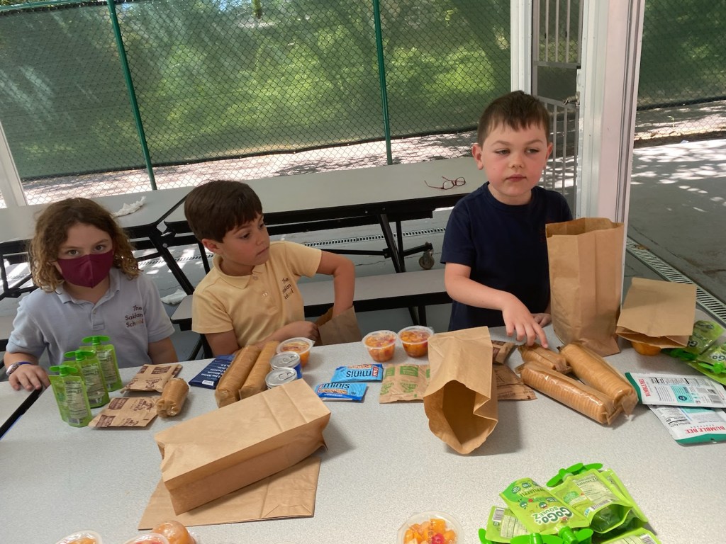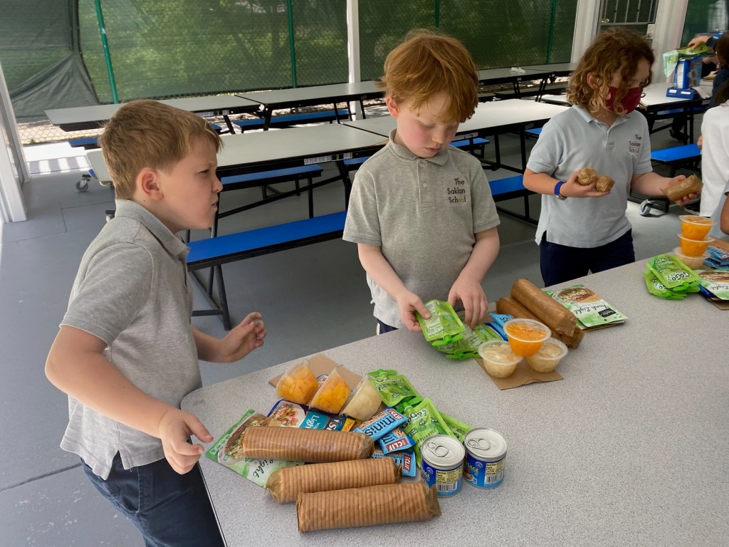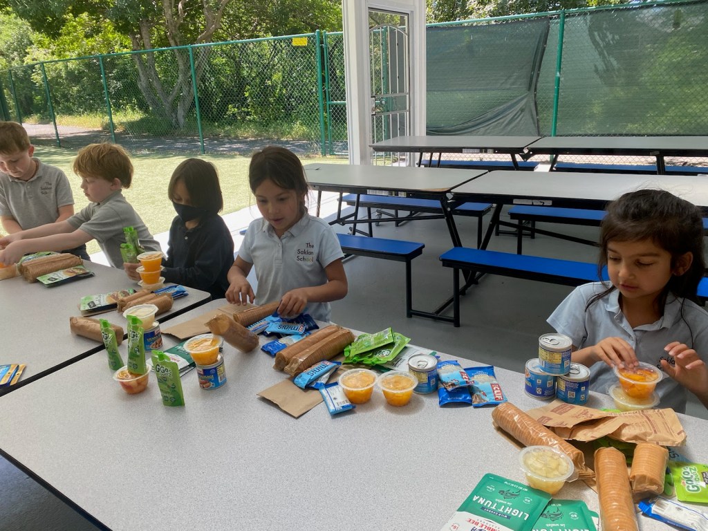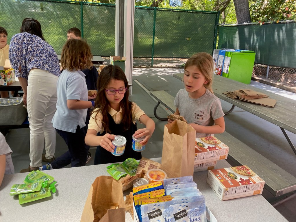 After lunch last Friday, our 1st graders had a packing party! No, they weren’t preparing to move, but rather packing lunch bags to be distributed to homeless individuals. Partnering with the organization 10,000 Lunches, the class packed 45 brown bags, carefully adding one of each food item per bag: tuna, instant oatmeal, Ritz crackers, fruit cup, sun butter, protein bar, and a can of Vienna sausages.