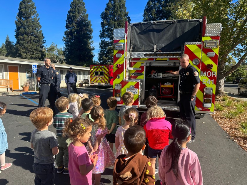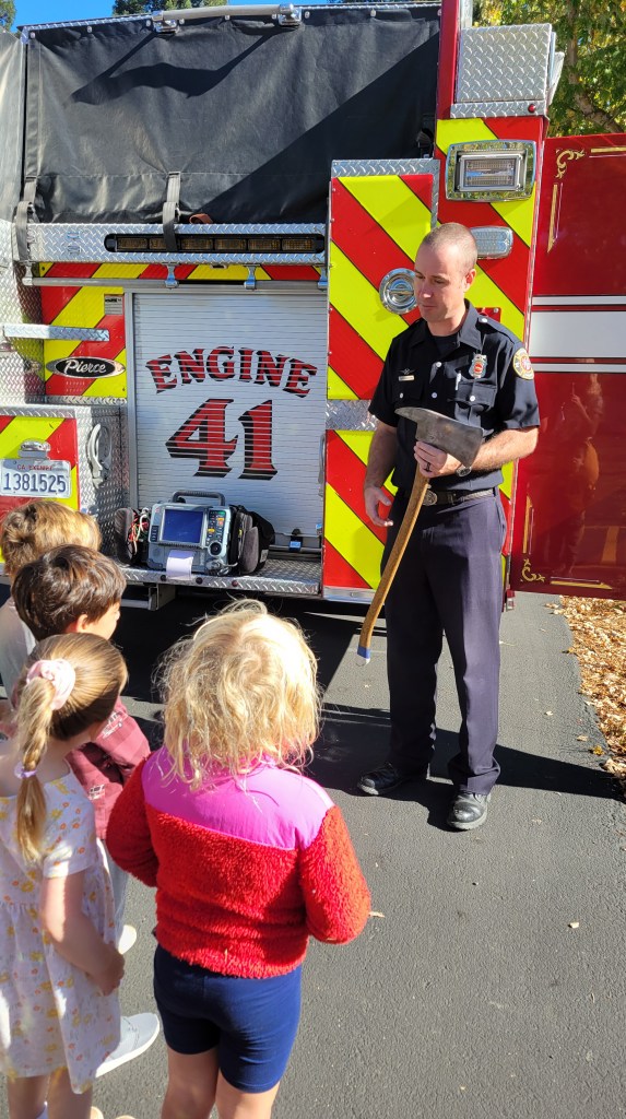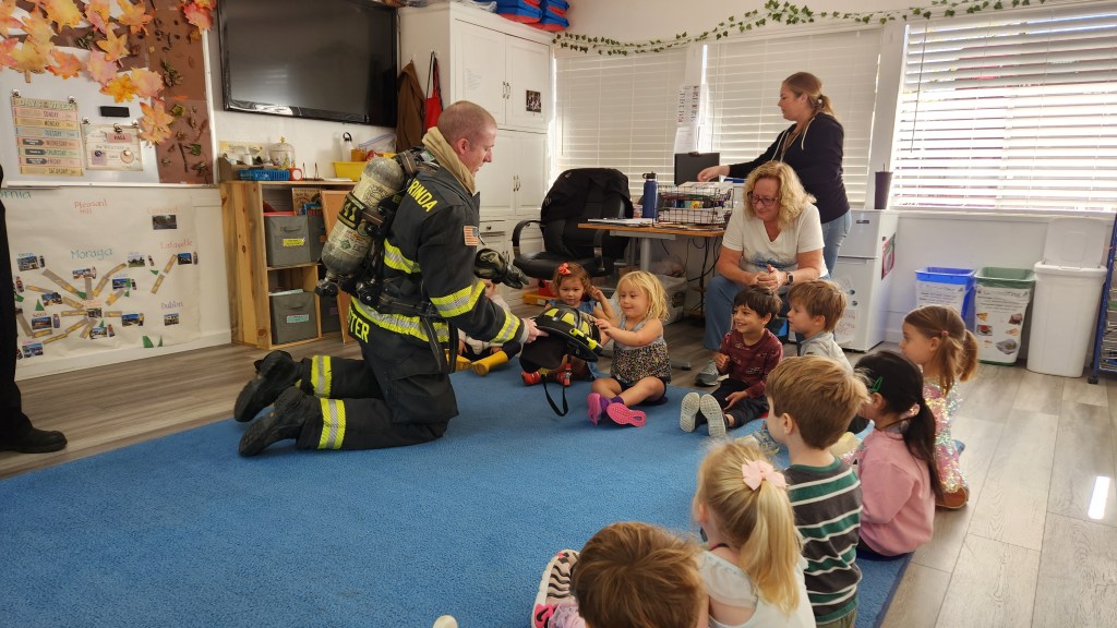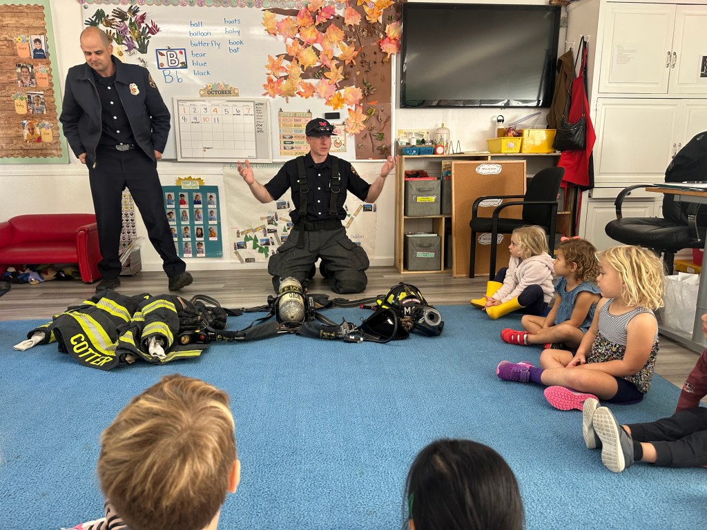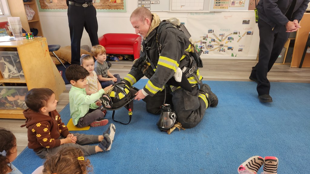 The Owlets continue to be actively engaged in discovering the wonderful world of community helpers! Talking about community helpers gives the students a better understanding of what it means to be a community and the importance of working together. Recently, the Owlets read the book Real Superheroes by Julia Seal, which taught them that doctors, teachers, grocery store workers, delivery drivers, and firefighters are all community helpers. The preschoolers were very excited to meet firefighters from the Moraga station when they came to campus!