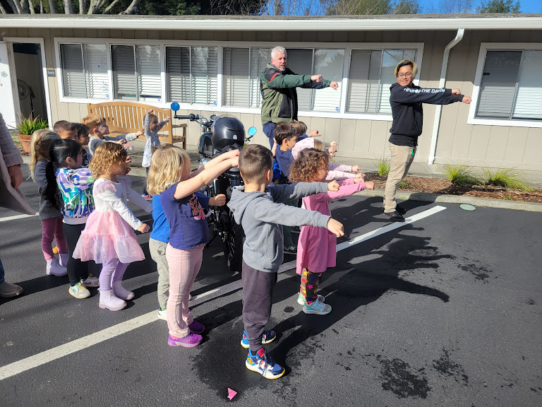 While studying the letter M, the Owlets were excited to welcome a familiar guest expert to share a motorcycle with them – David! David showed the preschoolers his motorcycle, pointing out the wheels, lights, gas tank and exhaust pipe, but the Owlets were most excited about the horn! After showing the students the safety gear needed to ride a motorcycle, David taught the Owlets how one drives a motorcycle, using your right hand like the gas pedal or the throttle, and the left to brake.