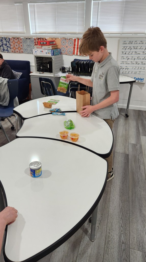 After sharing the book, Saturday at the Food Pantry, the Family Group leaders explained that the day’s family group activity was to make bagged lunches for those who are food insecure in our community. Each group then worked together to make 20 bagged lunches, each containing a can of Vienna sausages, fruit cup, fruit squeeze, oatmeal, granola bar, peanut butter, crackers and tuna.