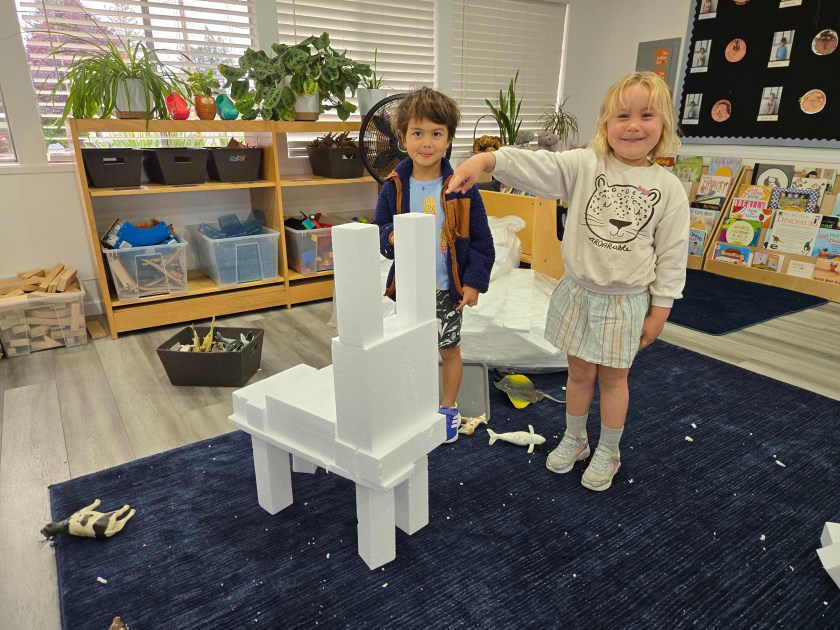 After learning new things, the students make representations. Not everyone makes the same things, as each student makes what they are interested in. Some molded a cow out of model magic and others built a cow using big Styrofoam pieces!