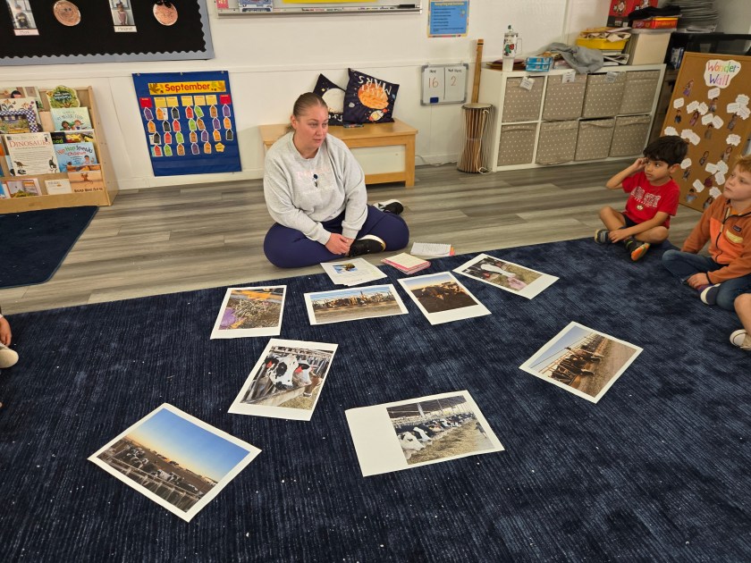 The Hoot Owls have enjoyed talking about things found at the farmers market: fruits, vegetables, cheese, flowers, crepes, popcorn, and more. The class wondered where cheese comes from, so they invited a dairy cow expert, Erin, to help answer their question. They also came up with other questions about cows: