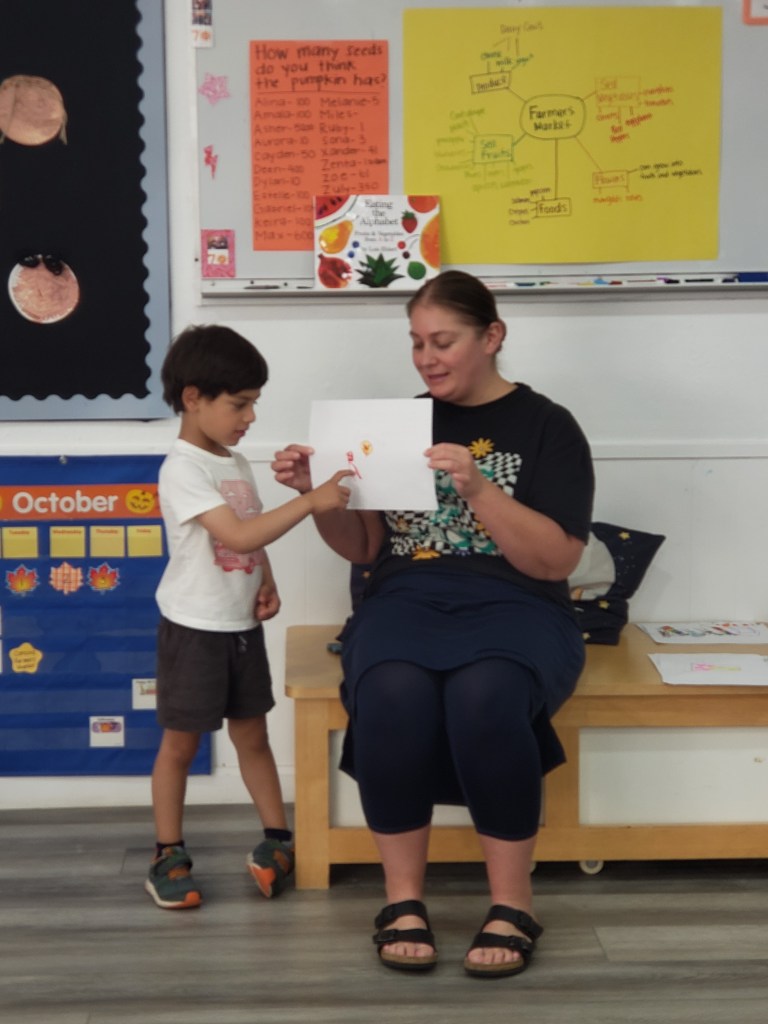 The Hoot Owls have begun a Project in which they are diving deep to learn about the Farmers’ Market! First, they worked on writing and illustrating stories about their real-life experiences at the farmers’ market. If the students hadn’t been to one, they imagined what it might be like. The Hoot Owls then took turns sharing their stories at circle time. This helps the children get more comfortable speaking in front of a large group and helps them feel proud of their work. Their fellow Hoot Owls asked questions about the stories, which allowed them to practice using the question sentence structure and to ask questions relevant to the topic.