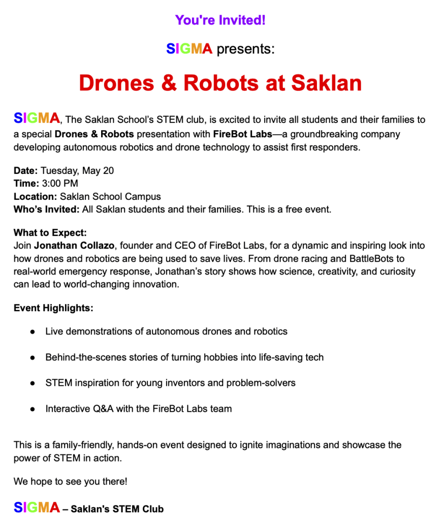 Saklan’s SIGMA Club invites all Saklan students and families to a special Drones & Robots presentation with FireBot Labs next Tuesday, May 20th, at 3:00 p.m. on the sports court. FireBot Labs founder and CEO Jonathan Collazo will be on campus to share a live demonstration of autonomous drones and robotics and to answer questions. We hope you can join us!