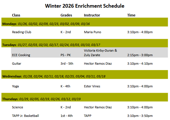 Now that the fall session of enrichment has come to an end, we are excited to share the classes that will be offered during the next enrichment session! For the winter session, the following classes are available: