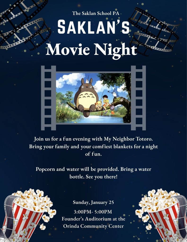 All Saklan families are invited to join us for our annual Saklan Movie Night on Sunday, January 25th, from 3:00-5:00 p.m. in the Founders Auditorium at the Orinda Community Center (next to the Orinda Library).