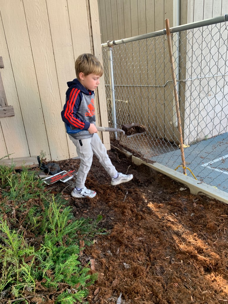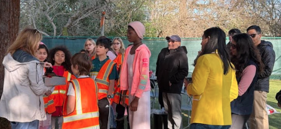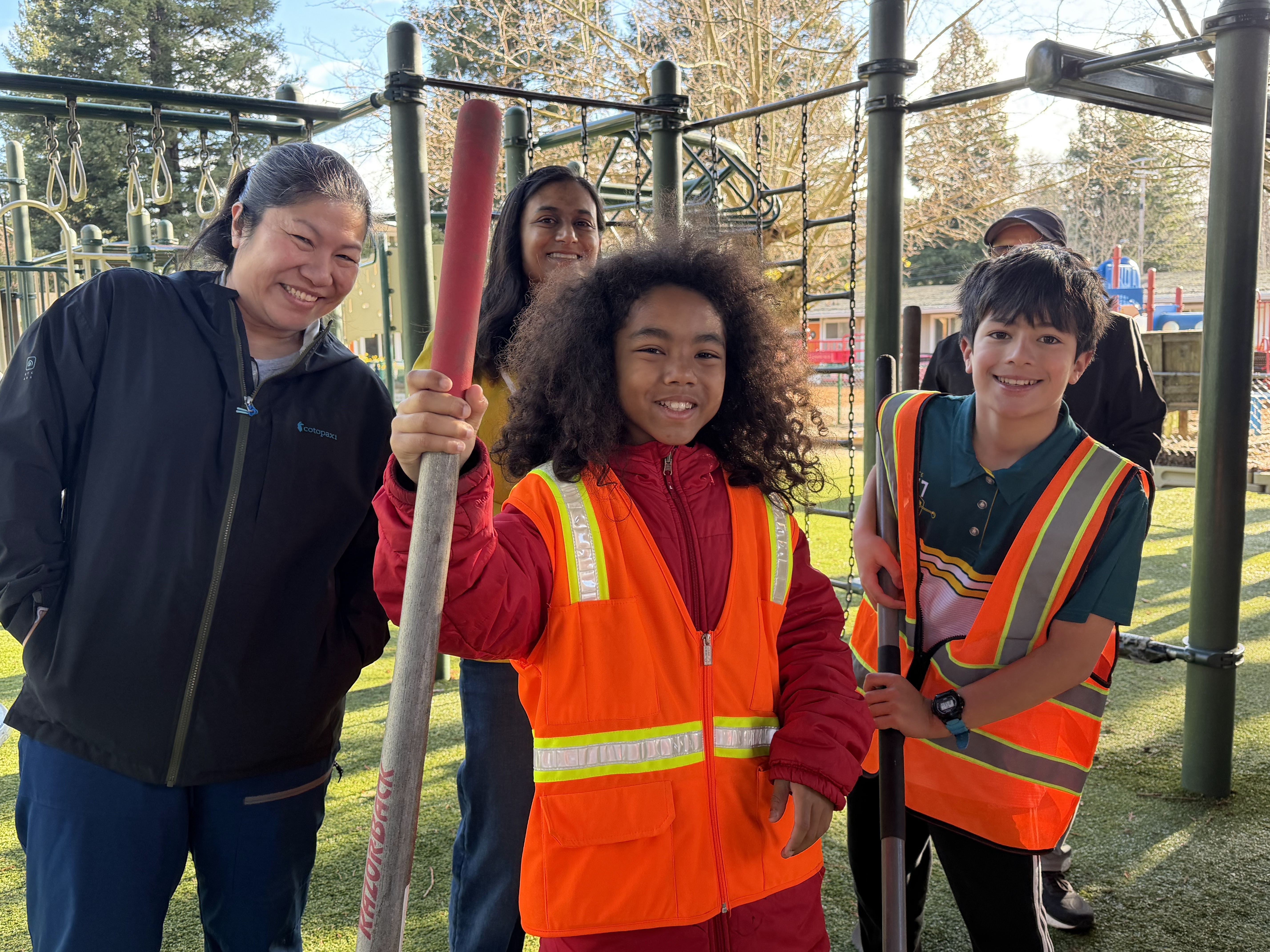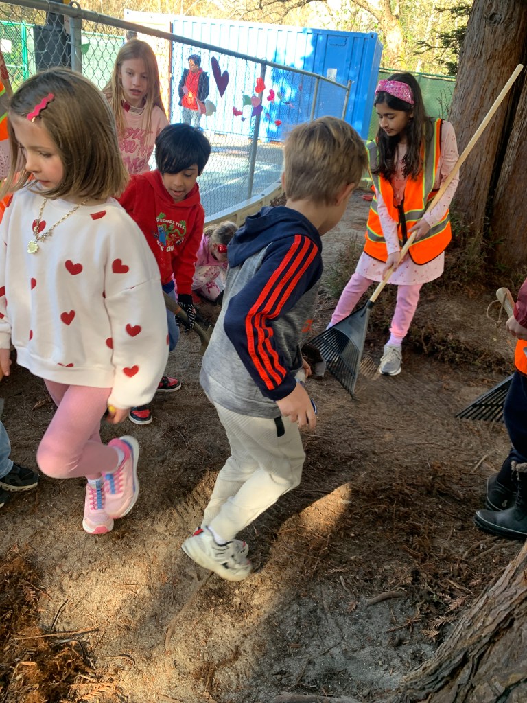 The work didn’t stop there. During recess, fifth graders invited younger students to help restore the next section of the grove, modeling leadership and stewardship. Even steady rain at lunchtime could not dampen their momentum. Paths were raked, clear “go” and “no-go” zones were established, and by the end of the day, the transformation of the grove was visible.