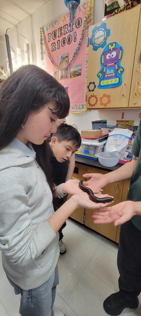 The highlight of the visit was the opportunity for students to interact directly with a variety of live creatures. With a mix of curiosity and courage, students were able to pet, hold, and even smell some of the arthropods, including stink beetles, two types of walking sticks, grasshoppers, a whip scorpion, and an African millipede.