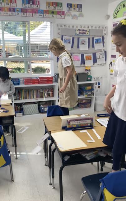 The first graders learned about levers and balanced a lever on a fulcrum. They had an egg drop challenge and learned that an incline plane made it easier and safer to move a load. They made a paper helicopter and learned how a screw works. The class made funny faces with apples and sticks, and discovered that the sticks in the shape of a wedge made it easier to split the apple skin apart. They had a bubble race and learned how a wheel and axle makes work easier. Lastly, the class completed a “going up” activity, where they used a string as a pulleyso they didn’t have to lift the object with their hands.