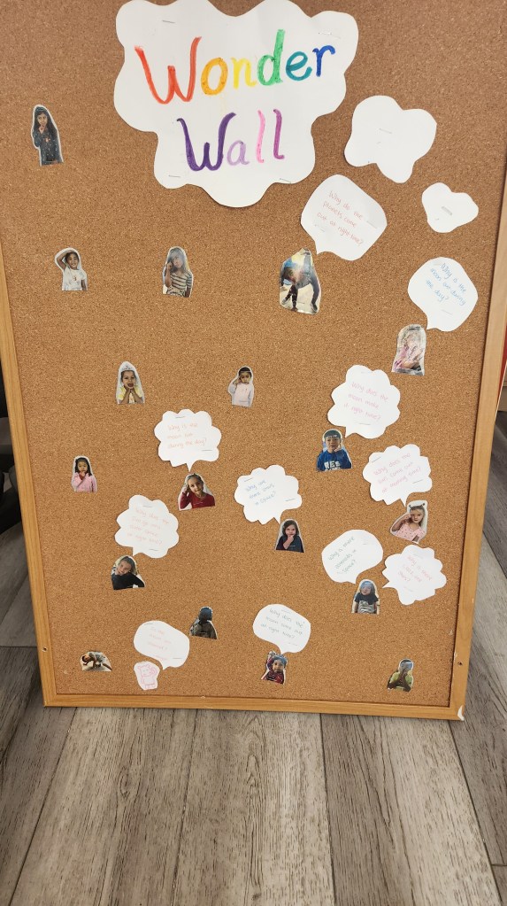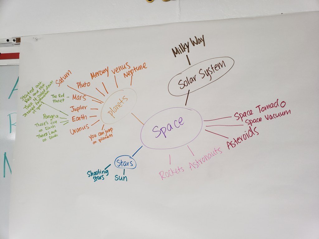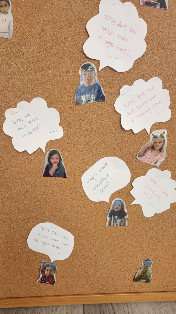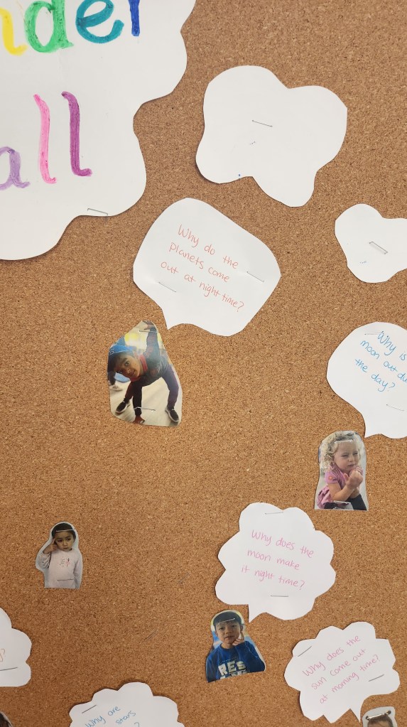 The Hoot Owls have emerged from their ocean unit and blasted off into space! To start their latest project-approach unit, the Hoot Owls made a topic web to showcase their prior knowledge of space. As they meet experts and read books, they will add to the web. They also created a space wonder wall, which they will continue to add questions to throughout the unit.