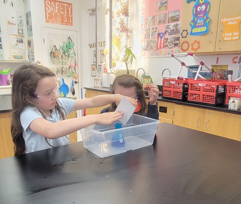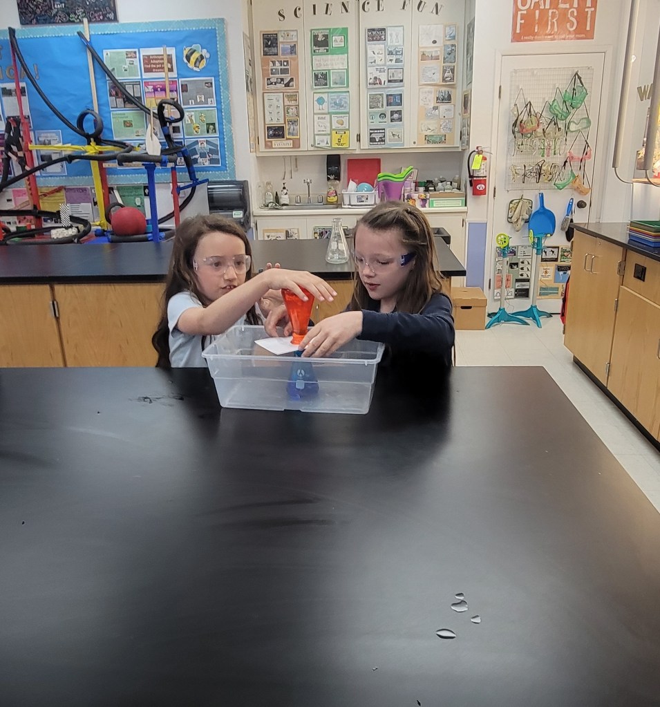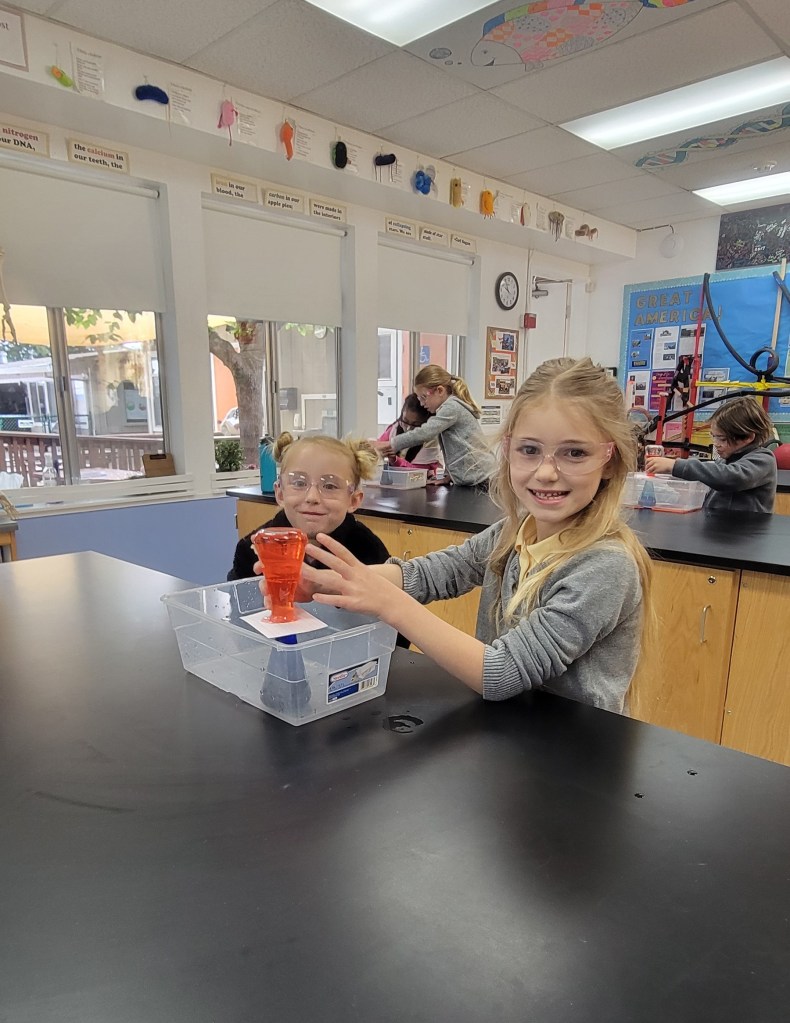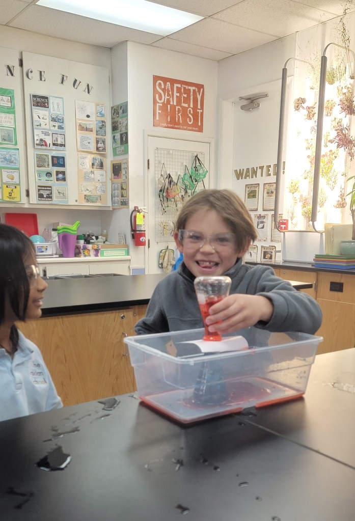 The pictures above are of the students investigating the movement of heat through fluids by convection, like in a lava lamp. Students layered cold water (blue) on top of hot water (red) and watched them switch places. Then they put hot water (red) on top of cold (blue) and saw they did not switch, proving that in fluids heat rises and cold sinks.