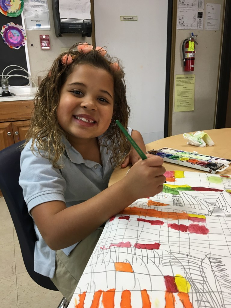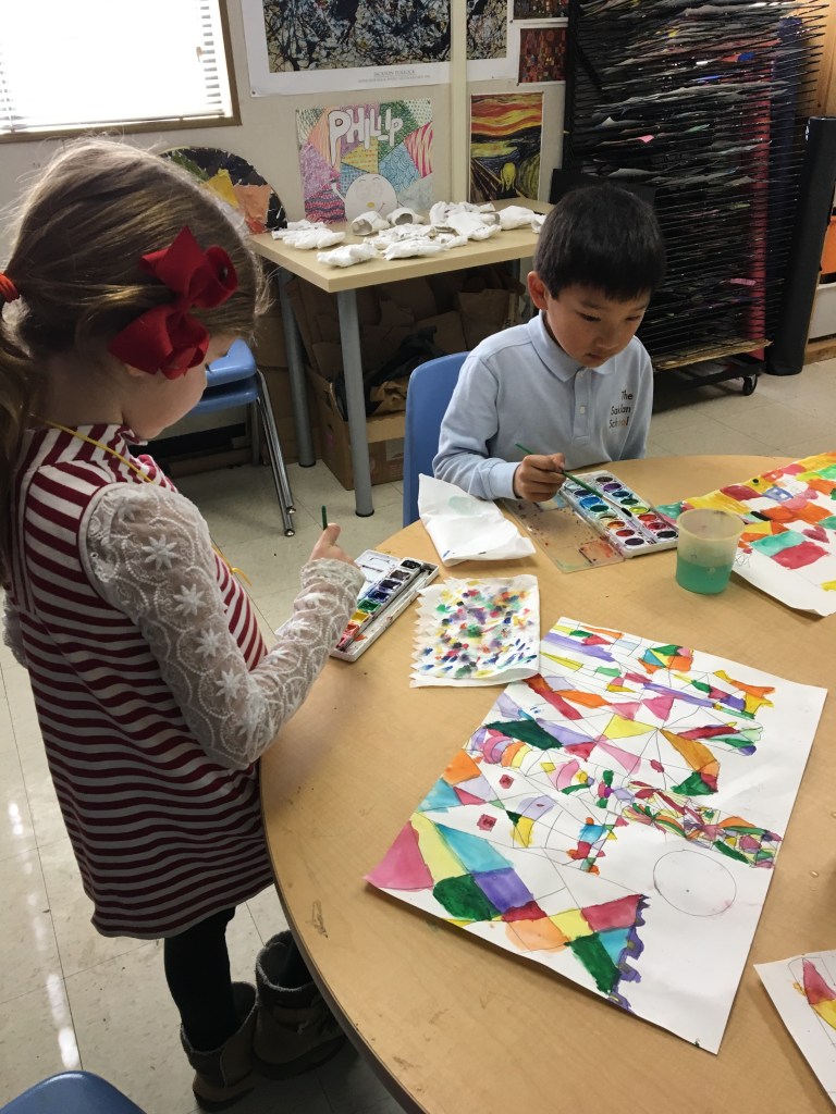 The first grade recreate Paul Klee’s Castle and the Sun. Using rulers, they started with a castle outline and then continued dissecting each building in the cubist style. Here they use watercolor and evenly distribute the colors for a cohesive composition.