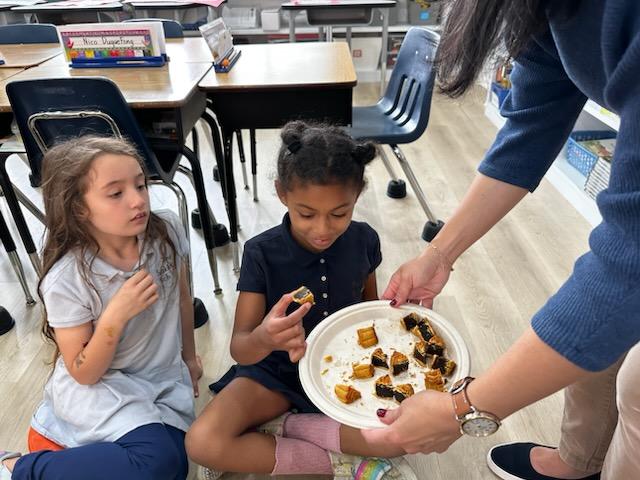 The first and second graders welcomed Dana, a first-grade parent, who also read a book about the Mid-Autumn Festival, and then shared her experience and family traditions with the festival. The students were excited to try mooncakes, a pastry filled with lotus seed paste and an egg yolk in the middle, which Dana brought in for them to try. Some students really enjoyed the mooncakes, others not so much, but it was fun to try!