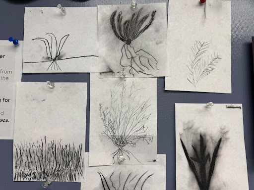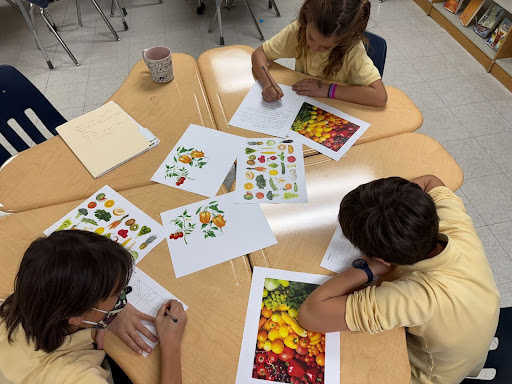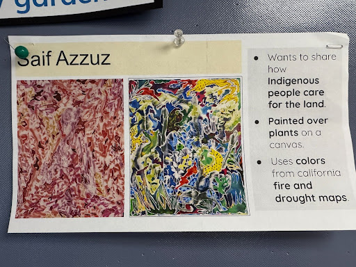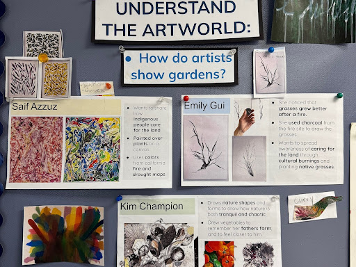 The unit then moved on to explore artists whose work focuses on gardens, nature, and tending to the environment. Made with charcoal scavenged from the scorched earth after a wildfire, Emily Gui’s drawings of wild grasses that emerged after the fire, connected to the 3rd graders’ research on native plants earlier this year. It was also a jumping off point to help expand the students’ definition of what a garden may mean to different peoples. They compared drought maps to the work of Saif Azzuz, which often focuses on the importance of tending the California landscape through the Indigenous wisdom of cultural burns and the varied medicinal uses of native plants, as seen in his recent installation at Stanford Research Park. Finally, students considered the impact of color, and what happens to our interpretation of artworks when color is removed using works by Kim Champion. It struck students that when the color was removed from her art, often much of the meaning was lost and the figures became harder to identify.