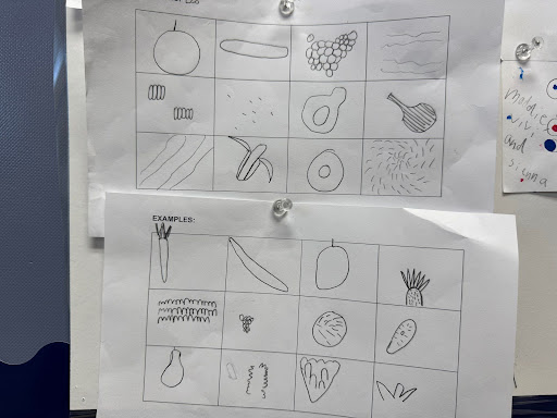 Additionally two small groups considered the ways line and shape can help us communicate our theme. One group felt a sense of curiosity when considering the theme of “garden” and worked to create a line language for our backdrop. Another considered the connection between the theme of “garden” and fruits and vegetables.