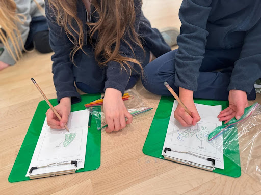 To spark their curiosity, the second graders explored a variety of maps. With notebooks in hand, they made observations and took notes about what they noticed. Next, they practiced using directional words to describe hidden objects, saying things like “between my desk and your desk” or “next to a bookshelf and under a clock.” Using a compass, they also discovered which sides of their classroom face north, south, east, and west.