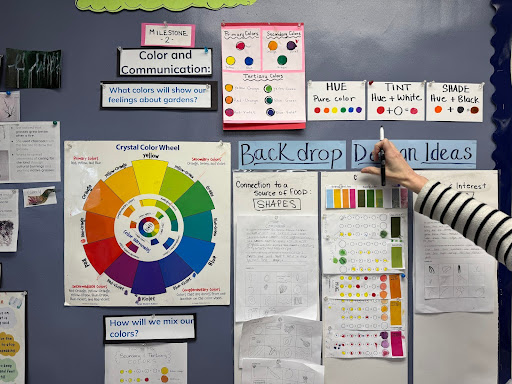 After exploring different artists’ interpretations of garden, students reflected on the feelings and connections to the theme that they wanted to express through their backdrop art. Three distinct groups emerged. One group most associated gardens with the feelings of excitement and joy, another with a sense of awe for life, and a third associated gardens with calm. Each feeling group identified colors to communicate those feelings using their growing understanding of the art world.
