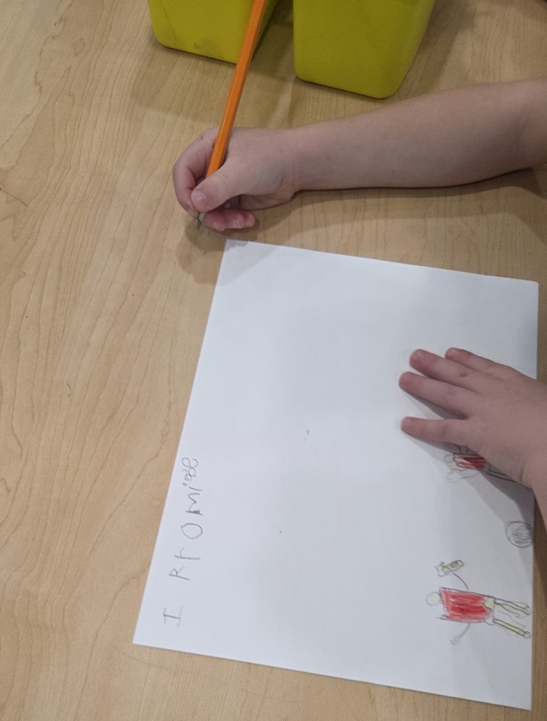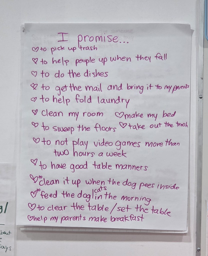 From there, the students took the lead. Together, they created a shared list of promises they might make to better themselves. Ideas flowed quickly and enthusiastically. Many children focused on helping at home, with promises like “I will do the dishes,” “I’ll clear the table,” and “I can help take out the trash.” Others centered their promises on kindness and empathy, committing to helping people who are hurt or feeling sad, actions they already practice each day.