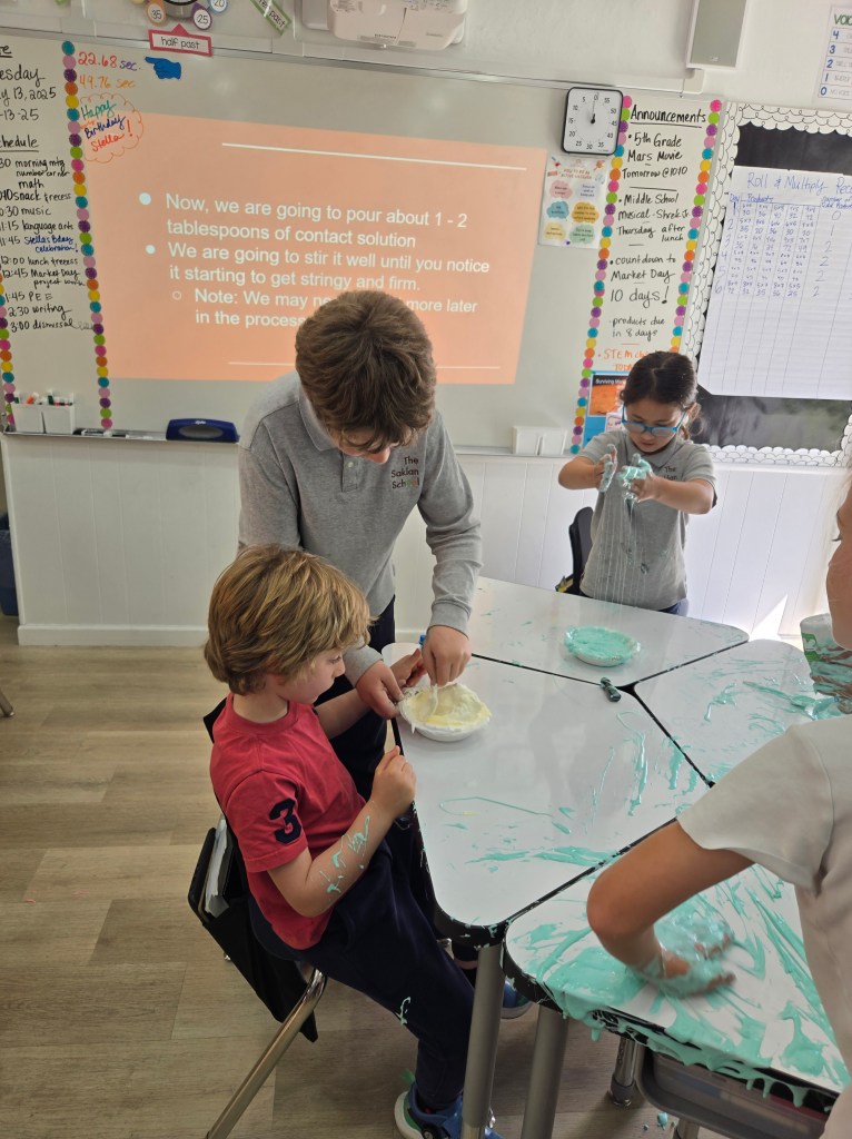 This gooey activity wasn’t just about creating something to take home—it was also a creative way to explore basic chemistry. Students learned that slime-making is a great introduction to chemical reactions. By combining everyday household ingredients like glue, shaving cream, and contact solution, students created a substance that behaves as neither a true solid nor a liquid, offering a fascinating look at how different materials interact.