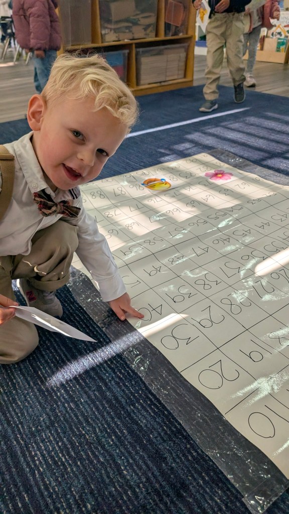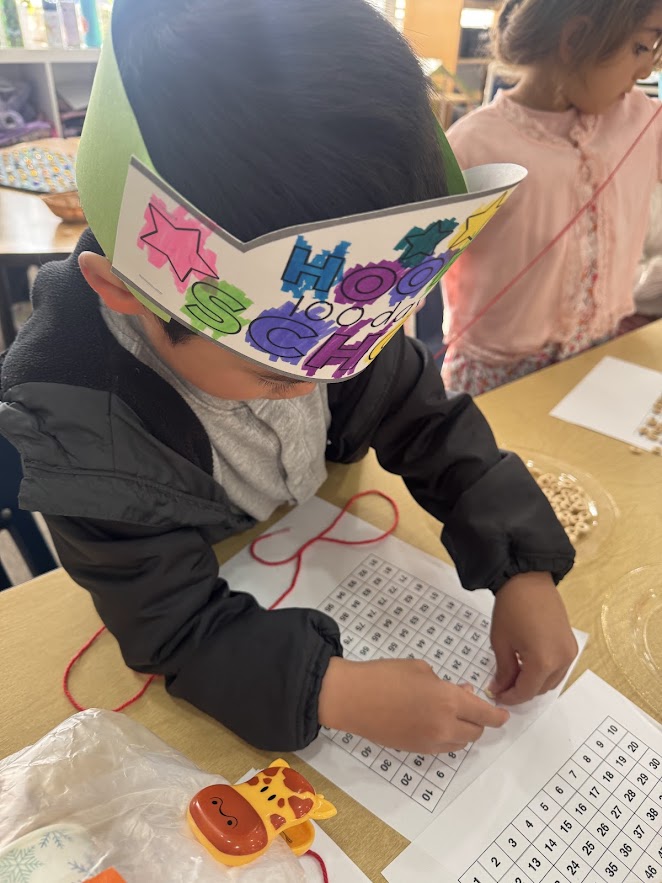 Kindergartners explored the concept of 100 in playful and delicious ways. They created their own 100th-day snack by combining 10 different treats, 10 pieces of each, bringing math to life in a tangible (and tasty) way. Students designed colorful hundred grids, crafted crowns, and proudly wore 100-Fruit-Loop necklaces. Movement was also part of the fun, as students danced for 100 seconds and completed 100 jumping jacks.