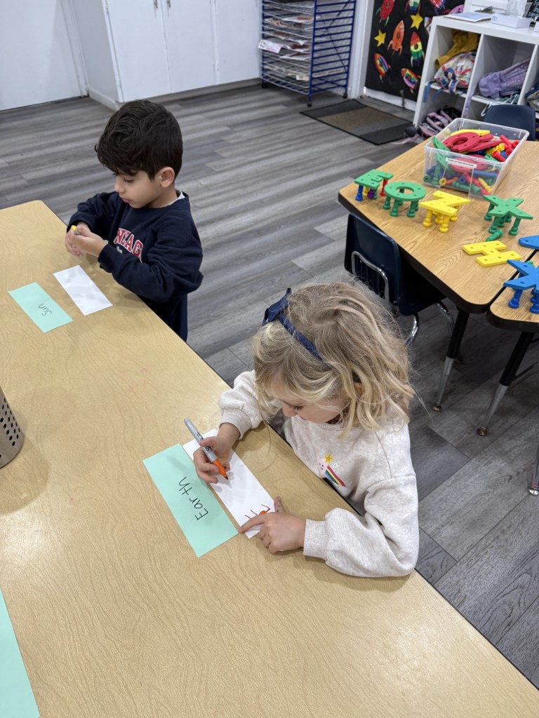 Next, the Hoot Owls turned their attention to one of the class’s favorite animals—dogs! They were thrilled to welcome two special guests: Saul, Saklan’s Middle School Math Teacher, and Mel, who brought along their two dogs, Banksy and Bixby. The Pre-K students came prepared with thoughtful questions, and Saul and Mel were happy to share their expertise.